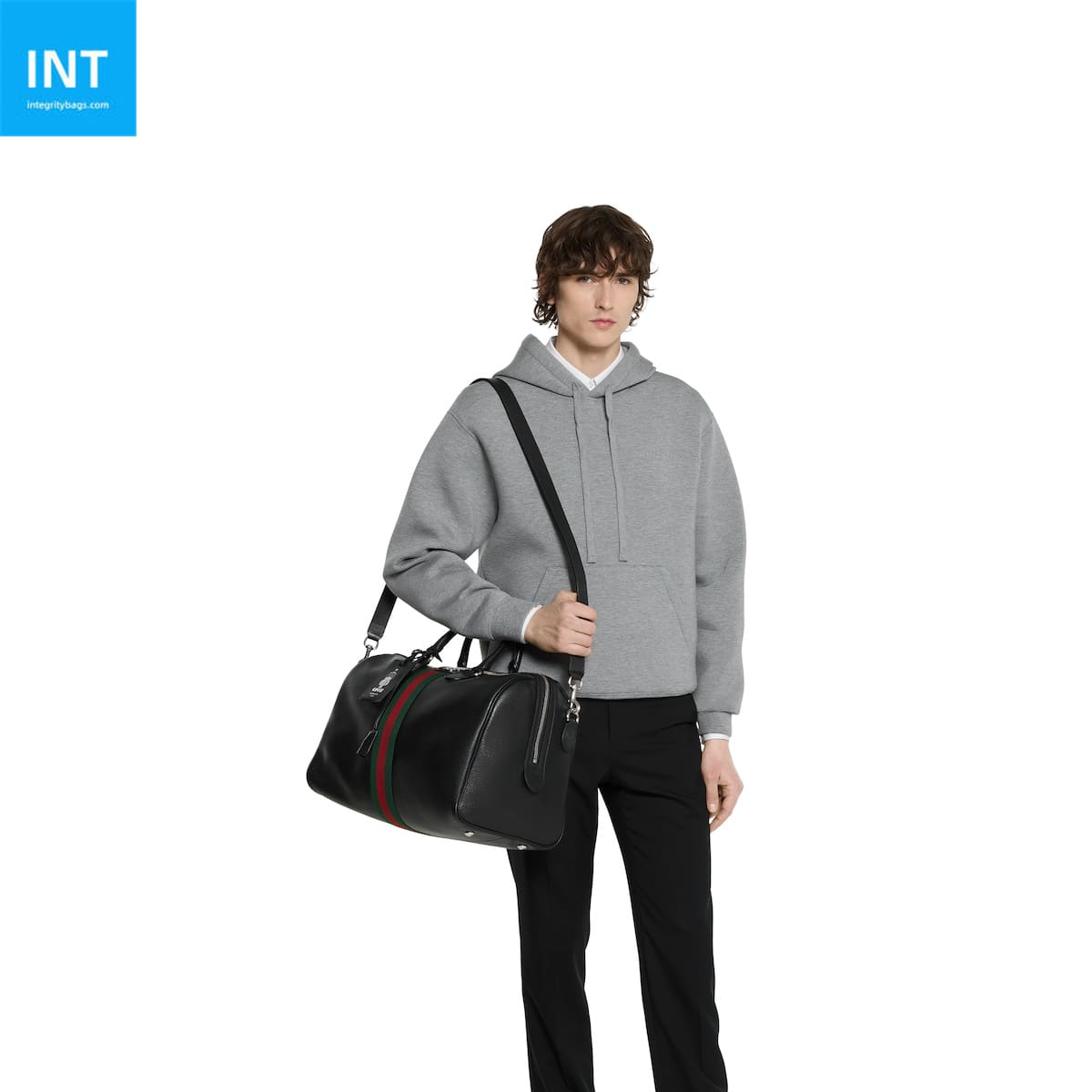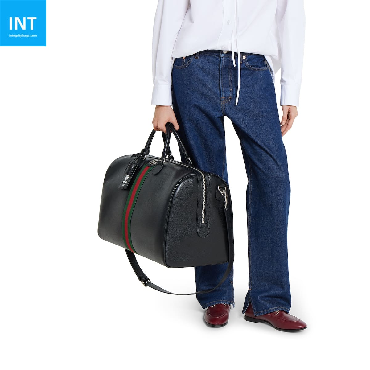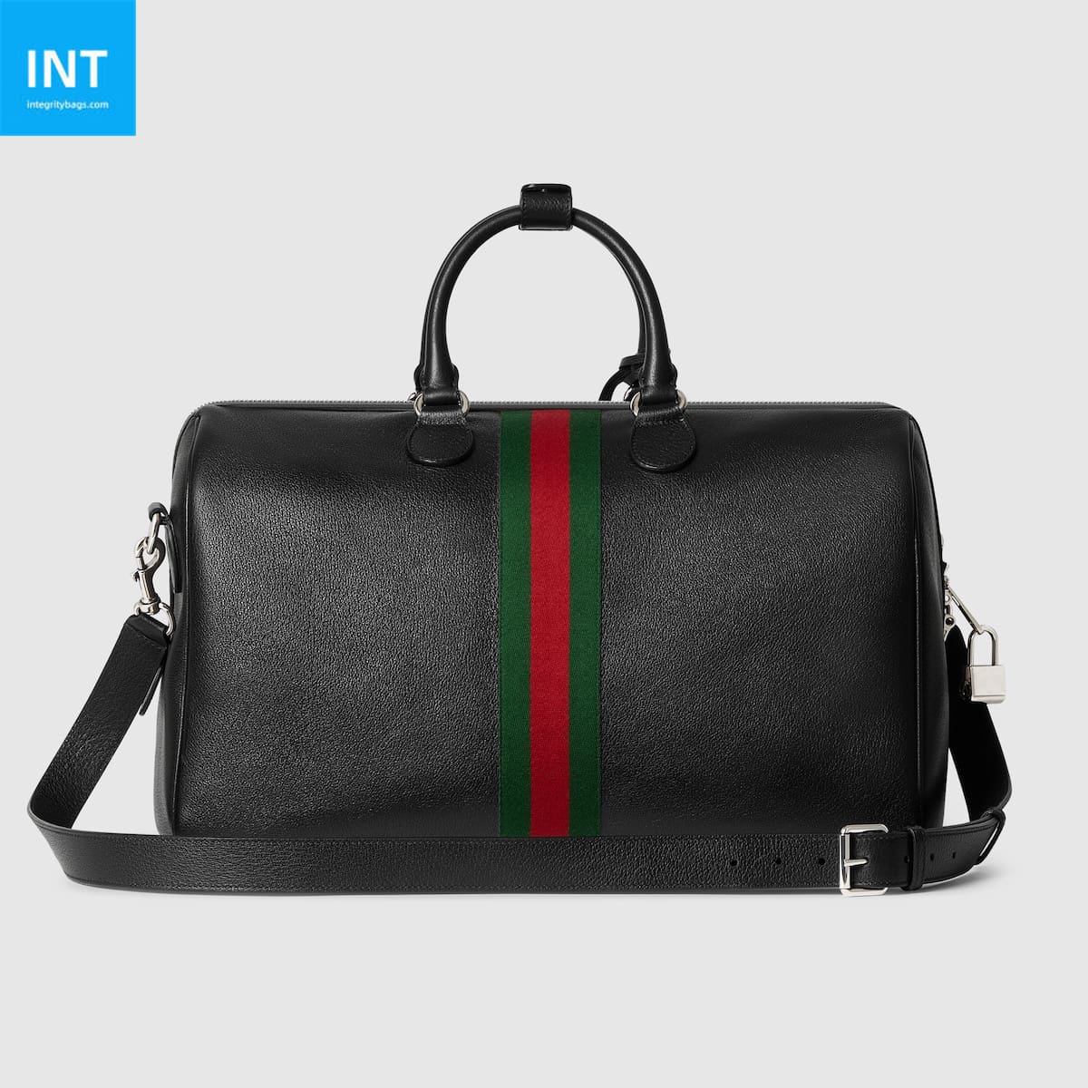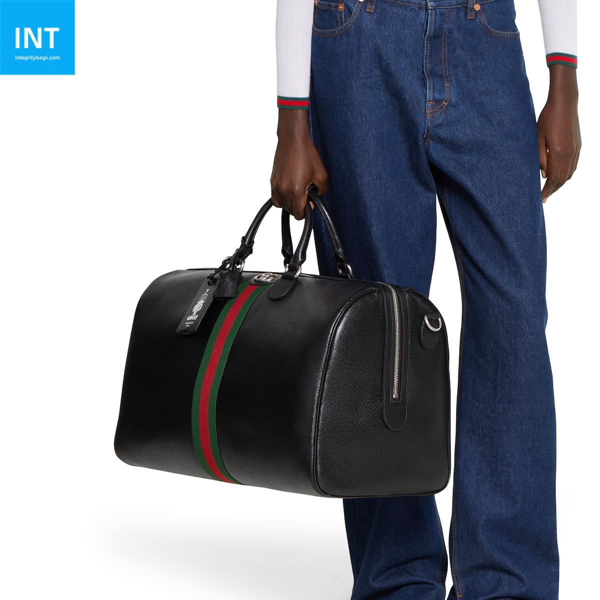 Gucci Savoy in black features sophisticated leather, elevating signature silhouettes. This duffle bag is presented in a soft leather with natural shine, revealing a Double G and Web detail.