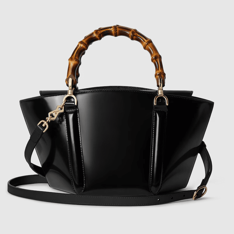 Introducing a bamboo top handle bag, this style from the women’s Fall Winter 2024 runway blends the House’s expert craftsmanship with its iconic motif. The basket-shaped bag reveals a hexagonal base, highlighting its artisanal construction. The small size in black is complete with a detachable shoulder strap.