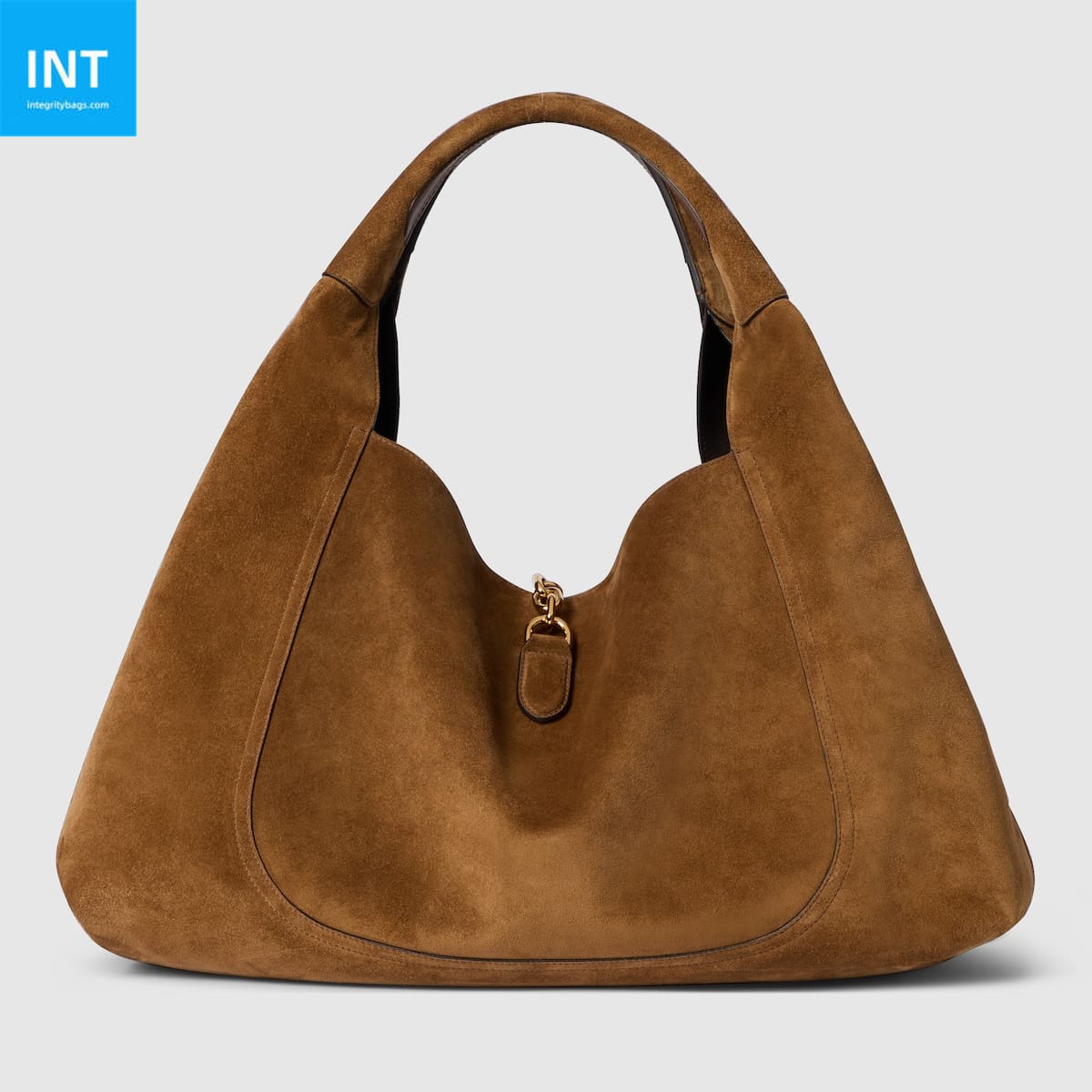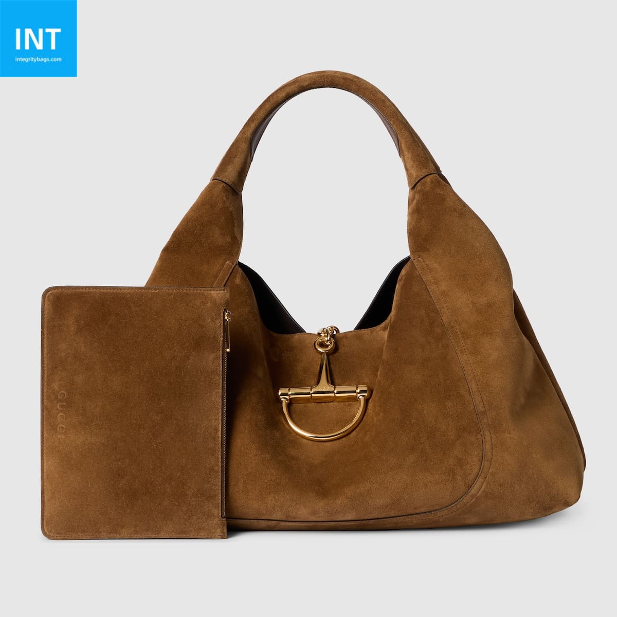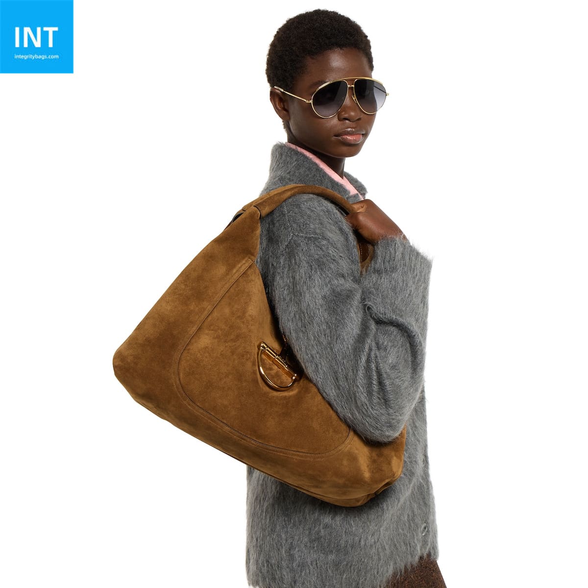 In the Fall Winter 2025 collection, the Gucci Softbit shoulder bag reimagines the House’s signature hardware as an oversized half Horsebit. It is both aesthetic and functional as the magnetic closure of the relaxed silhouette, crafted from suede with a soft leather lining.
