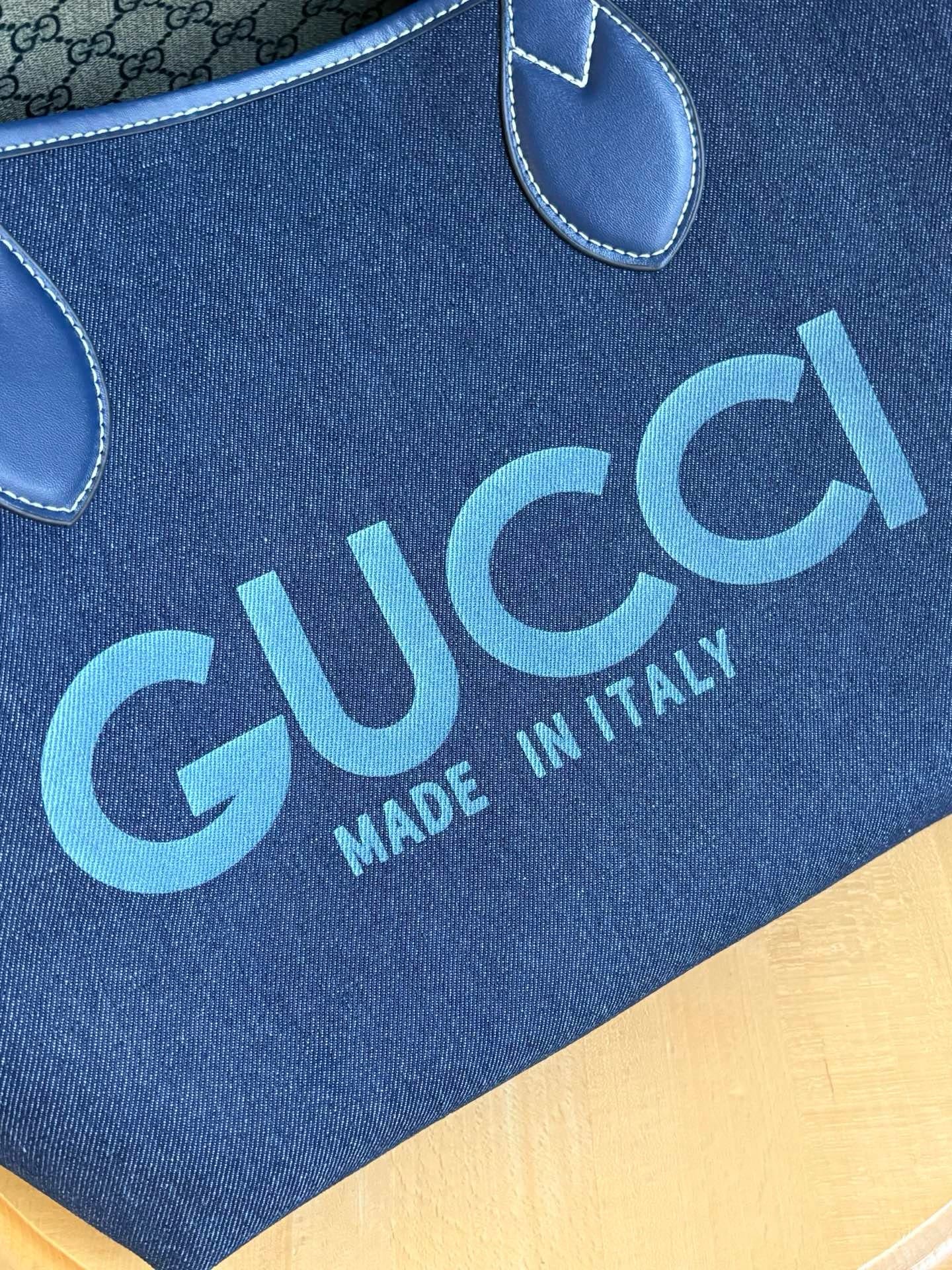 - Dark blue denim on one side, beige and blue GG Supreme on the other