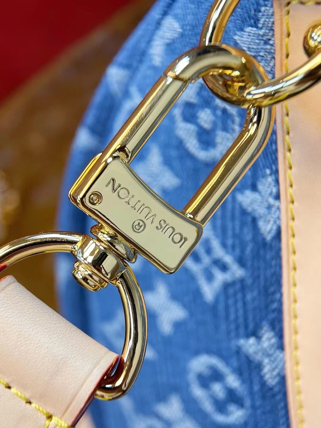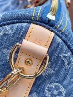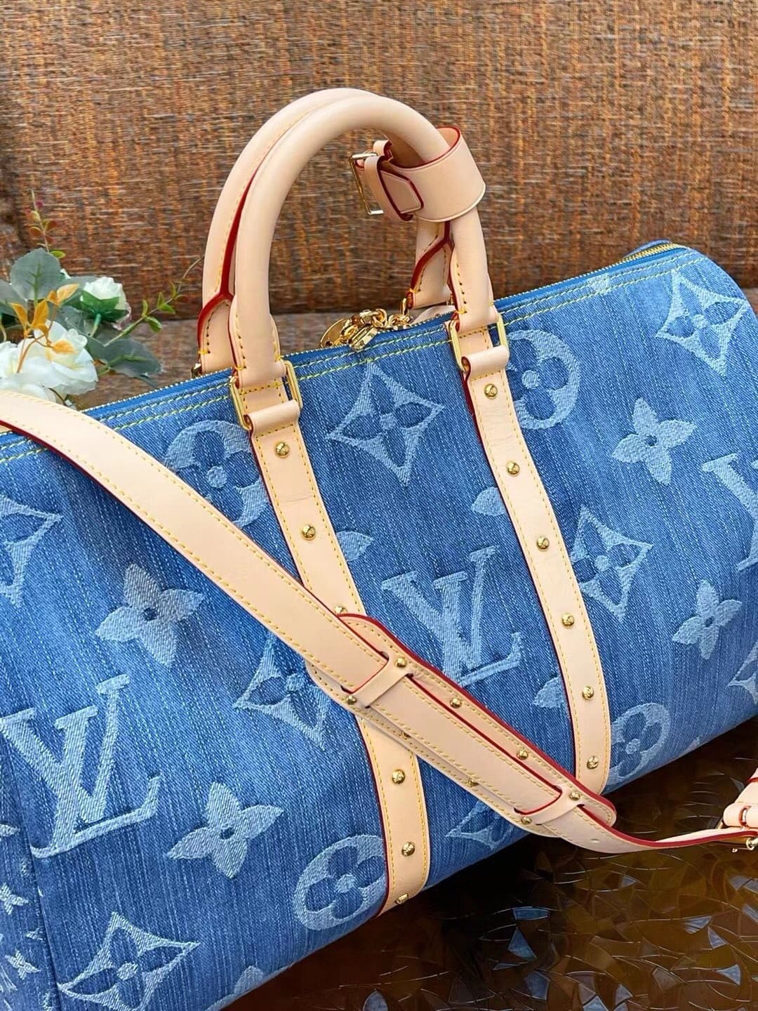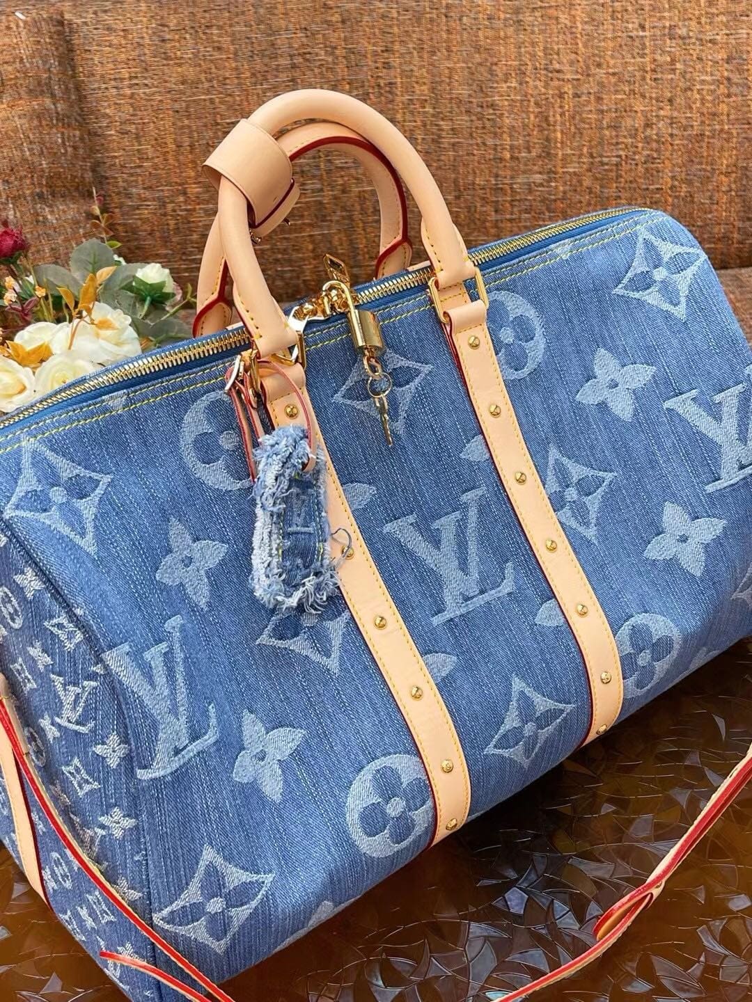 The classic Keepall Bandoulière gets a sporty-chic new look with the Monogram Denim theme. The House’s famous Monogram pattern is printed on certified organic canvas the color of blue jeans, creating an eye-catching contrast with the natural cowhide trim. Complete with a padlock and a removable strap, this spacious bag is ideal as a carry-on or for short trips.