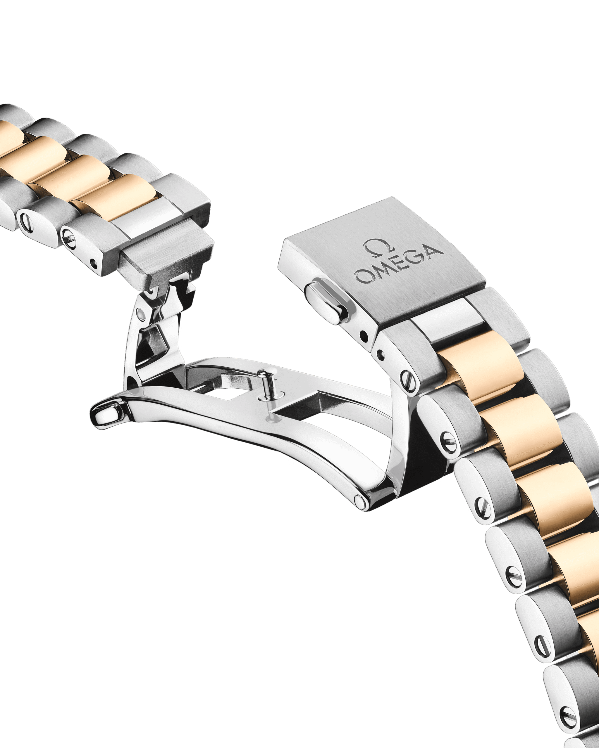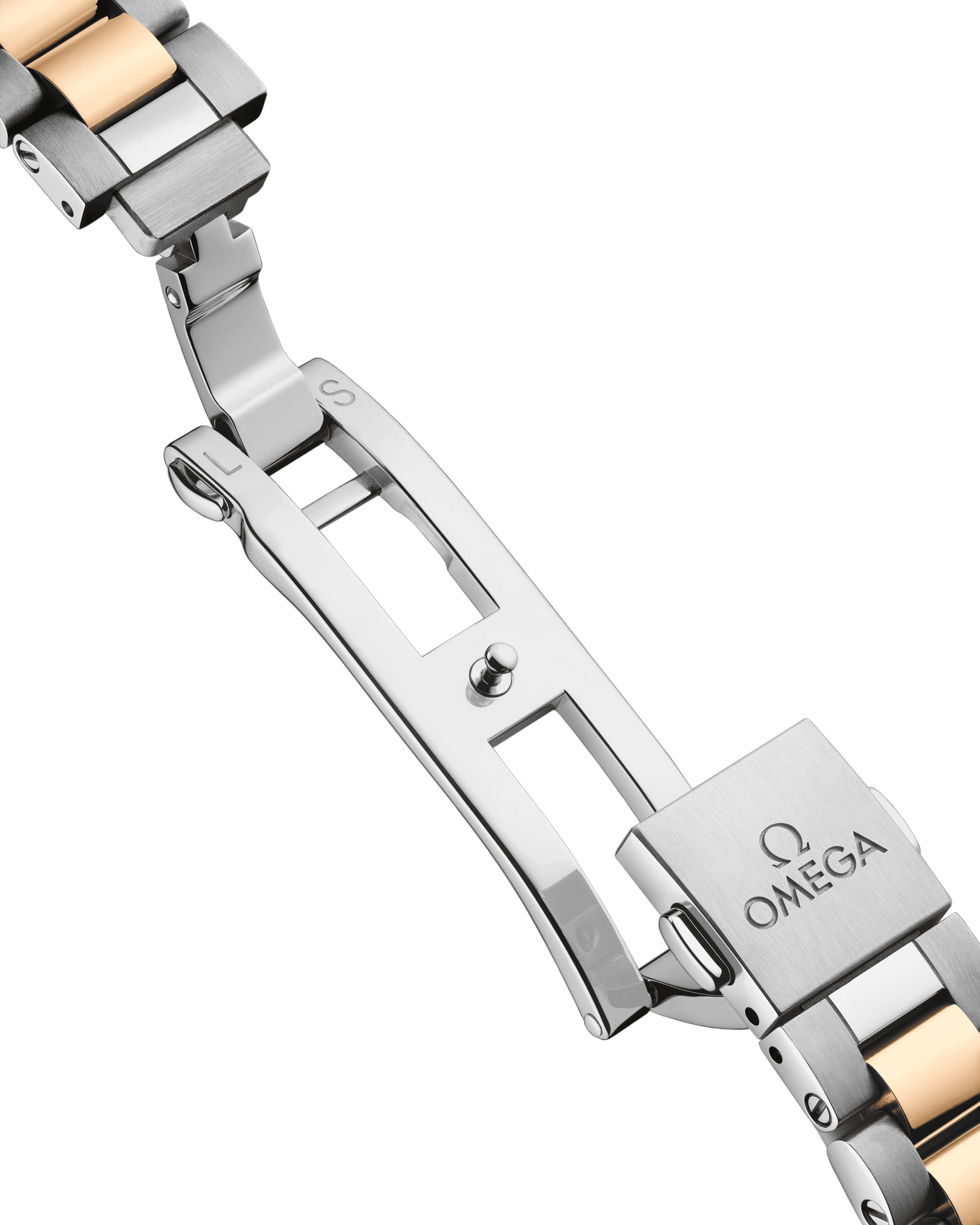 The watch is presented on an integrated stainless steel and 18K Moonshine? Gold bracelet with beautifully rounded polished-brushed links, a foldover butterfly clasp, and OMEGA??s easy comfort-adjustment system.