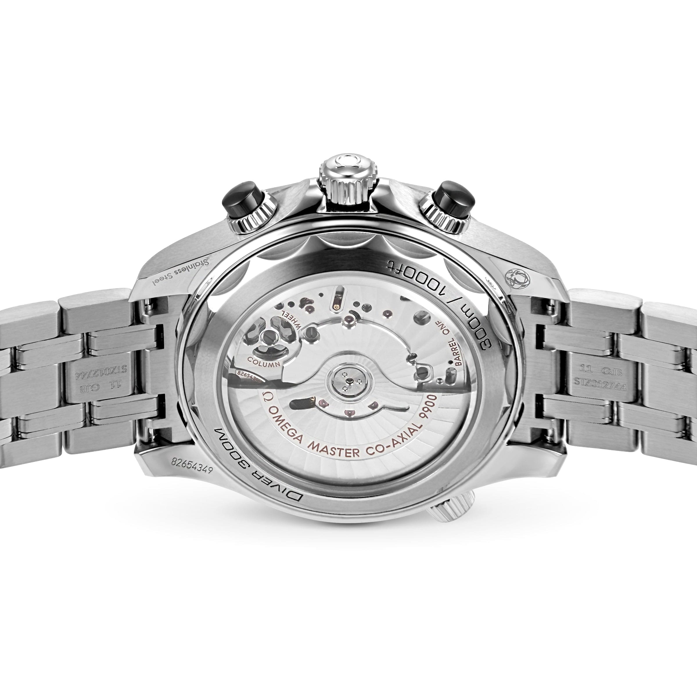 The classic dive watch for professionals, updated and refined 44mm chronograph model in stainless steel The choice of James Bond for over 25 years OMEGA Calibre 9900 – a Co-Axial Master Chronometer movement Polished black ceramic bezel and white enamel diving scale THE DIVERS CHOICE Since the original release in 1993, the Seamaster Professional Diver 300 has become a style icon and inspired a devoted following, being one of the first OMEGA timepieces to sport the Professional inscription on the dial amongst a push to update the heritage of the Seamaster with advanced technology and refined aesthetics. This iconic piece was immediately adopted by the James Bond franchise to best represent the alluring combination of dry martini elegance and action-packed durability of the world??s most famous spy. METAS CERTIFIED This 44 mm chronograph model has a stainless steel case with a polished black ceramic bezel and a white enamel diving scale. The chronograph pushers and dial match the bezel in polished black ceramic, featuring a laser-engraved wave pattern and a date window at 6 o??clock. The subdial hands are rhodium-plated, along with all other hands and indexes which are filled with white Super-LumiNova. The helium escape valve has been subtly redesigned with an easy-to- use conical design. The watch is presented on a stainless steel bracelet and is driven by the OMEGA Master Chronometer Calibre 9900, officially certified by METAS to resist magnetic fields up to 15,000 gauss. This industry-leading movement can be seen through the sapphire-crystal on the wave-edged caseback.