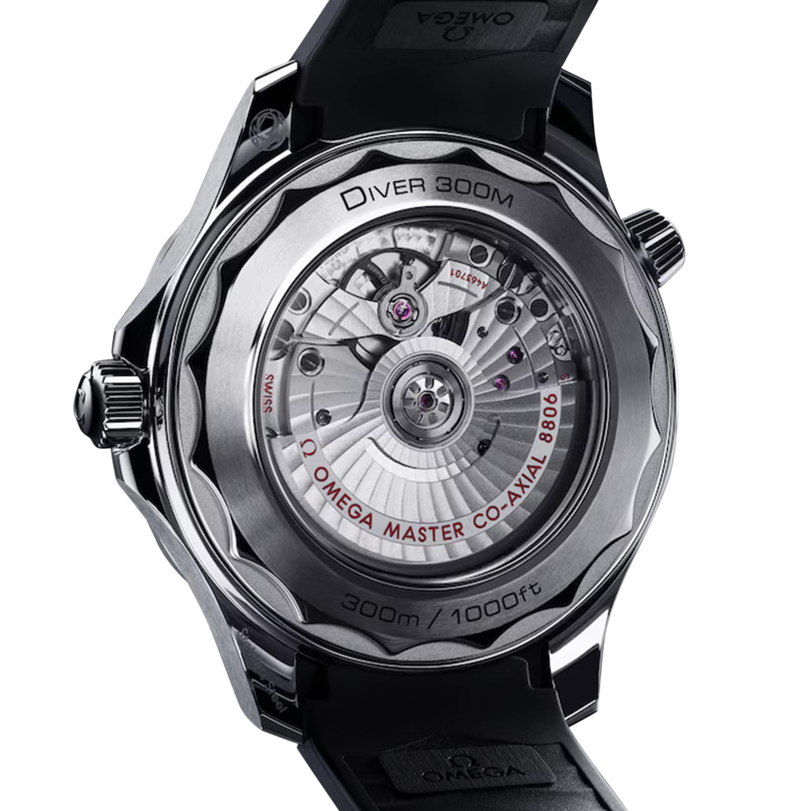 Since 1993, the Seamaster Diver 300M has enjoyed a legendary following. Today??s modern collection has embraced that famous ocean heritage and updated it with OMEGA??s most advanced innovation and design. This 42 mm model is crafted in stainless steel and includes a black oxalic anodized aluminium bezel ring with a diving scale in white Super-LumiNova. Black aluminium is also used to create the dial, which is laser-engraved with the Diver??s iconic wave pattern. The skeletonized hands and indexes are rhodium plated and filled with white Super-LumiNova, while the other markings, including the OMEGA logo, are transferred in white. The watch is presented on an integrated black rubber strap with foldover clasp, and is driven by the OMEGA Co-Axial Master Chronometer Calibre 8806, which can be seen through the sapphire-crystal caseback.