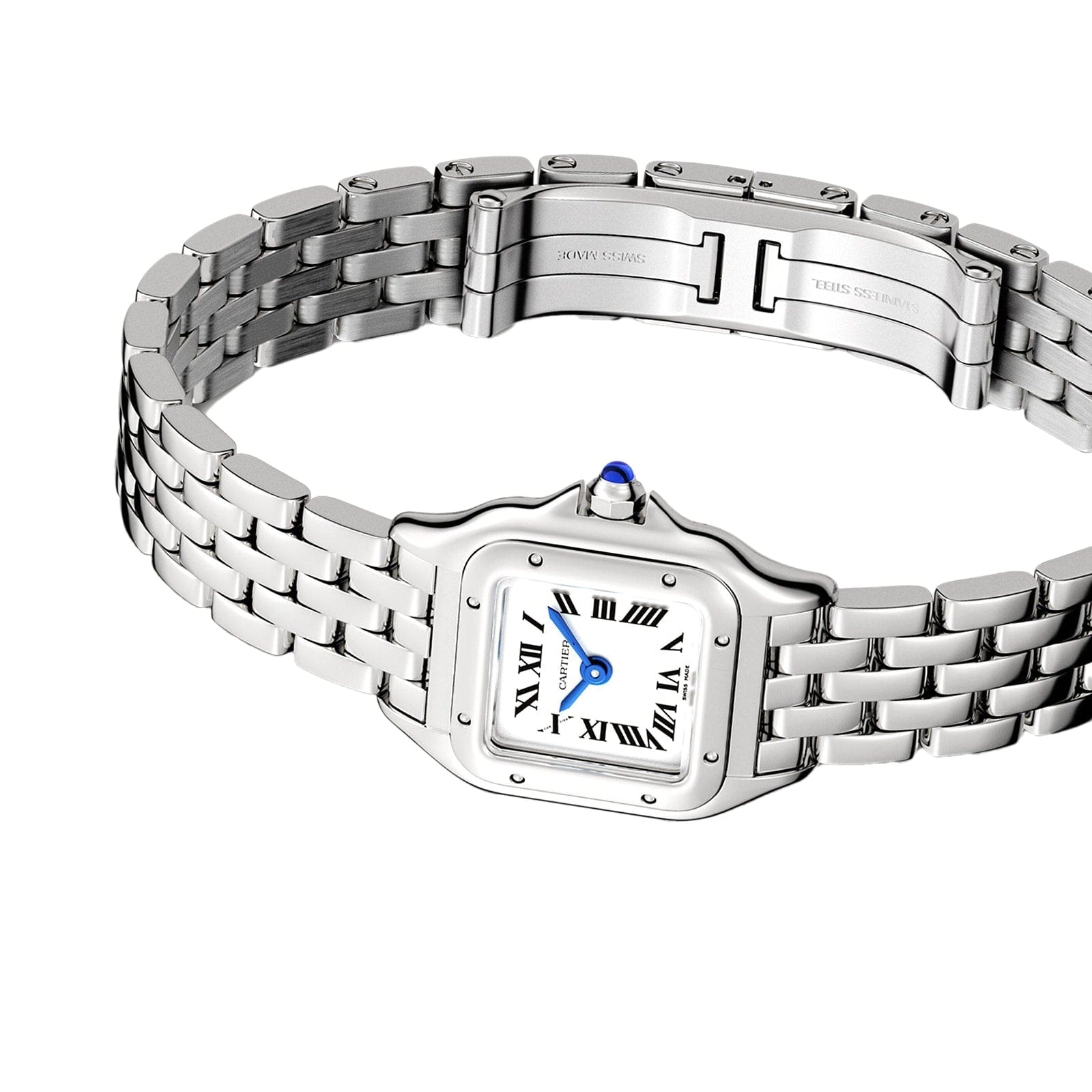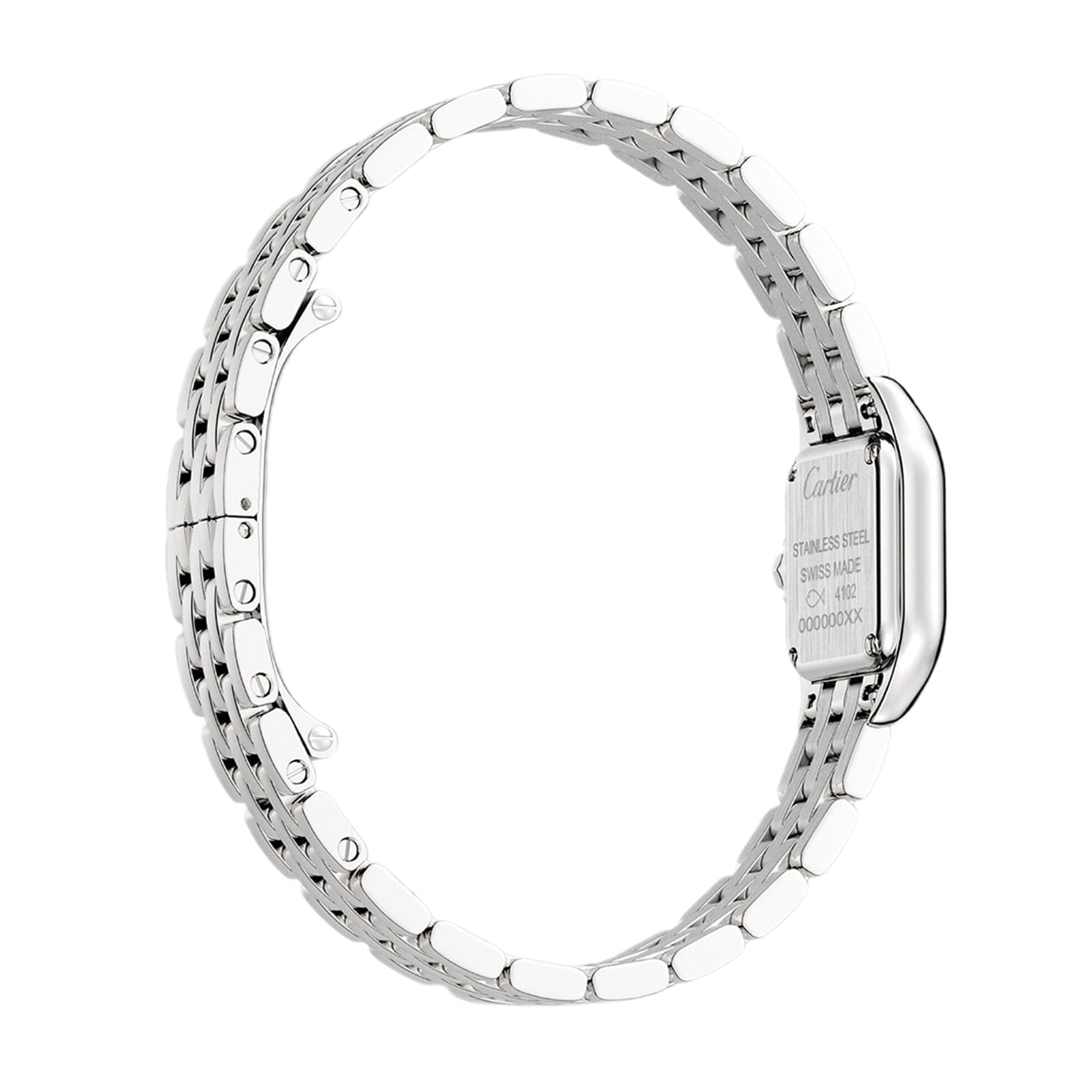 Panth??re de Cartier watch, mini model, quartz movement. Steel case and bracelet. Octagonal crown set with a blue synthetic spinel. Silver dial, blued-steel sword-shaped hands, sapphire crystal. Case dimensions: 25 mm x 19 mm, thickness: 6 mm. Water-resistant up to 3 bar (approx. 30 meters/100 feet).
