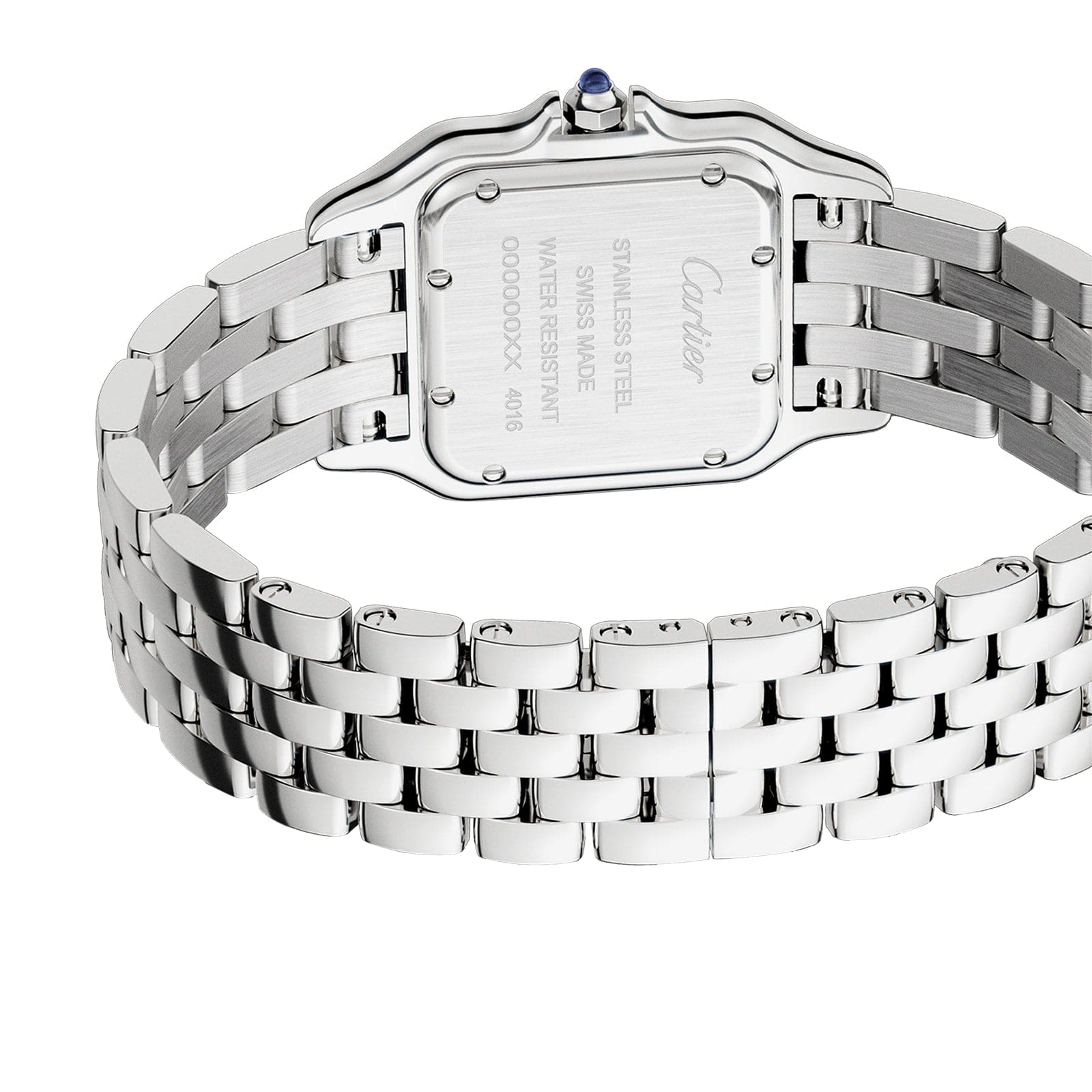 Panth??re de Cartier watch, medium model, quartz movement. Case in steel, dimensions: 27 mm x 37 mm, thickness: 6 mm, crown set with a synthetic blue spinel, silvered dial, blued-steel sword-shaped hands, steel bracelet. Water-resistant to 3 bar (approx. 30 meters) . At once a watch and jewel, the Panth??re de Cartier timepiece is one of the most distinctive Cartier designs. Born in the 80s and more contemporary than ever, it is a true style icon for women who wish never to go unnoticed. Explore the full Cartier range here.