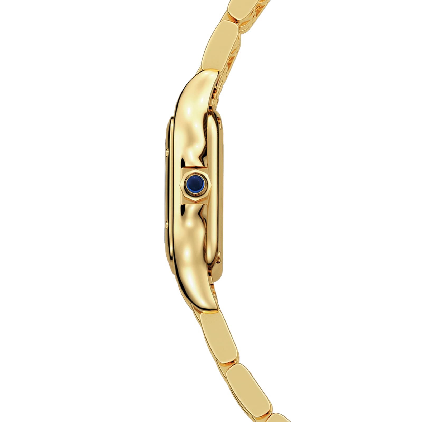 Panth???re de Cartier watch, mini model, quartz movement. 18K yellow gold case and bracelet. 18K yellow gold octagonal crown set with a sapphire cabochon. Silver dial, blued-steel sword-shaped hands, sapphire crystal. Case dimensions: 25 mm x 21 mm, thickness: 6 mm. Water-resistant up to 3 bar (approx. 30 meters/100 feet).