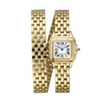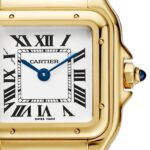 Panth??re de Cartier watch, small model, quartz movement. Case in yellow gold 750/1000, dimensions: 23 mm x 30 mm, thickness: 6 mm, crown set with a sapphire, silvered dial, blued-steel sword-shaped hands, yellow gold 750/1000 double loop bracelet, water- resistant to 3 bar (approx. 30 metres). Non-contractual photo (the length of the watch strap may vary slightly).