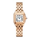 Panth??re de Cartier watch, small model, quartz movement. Case in rose gold 750/1000, dimensions: 23 mm x 30 mm, thickness: 6 mm, crown set with a blue sapphire, silvered dial, blued-steel sword-shaped hands, rose gold 750/1000 bracelet, water-resistant to 3 bar (around 30 metres). Non-contractual photo (the length of the watch strap may vary slightly).