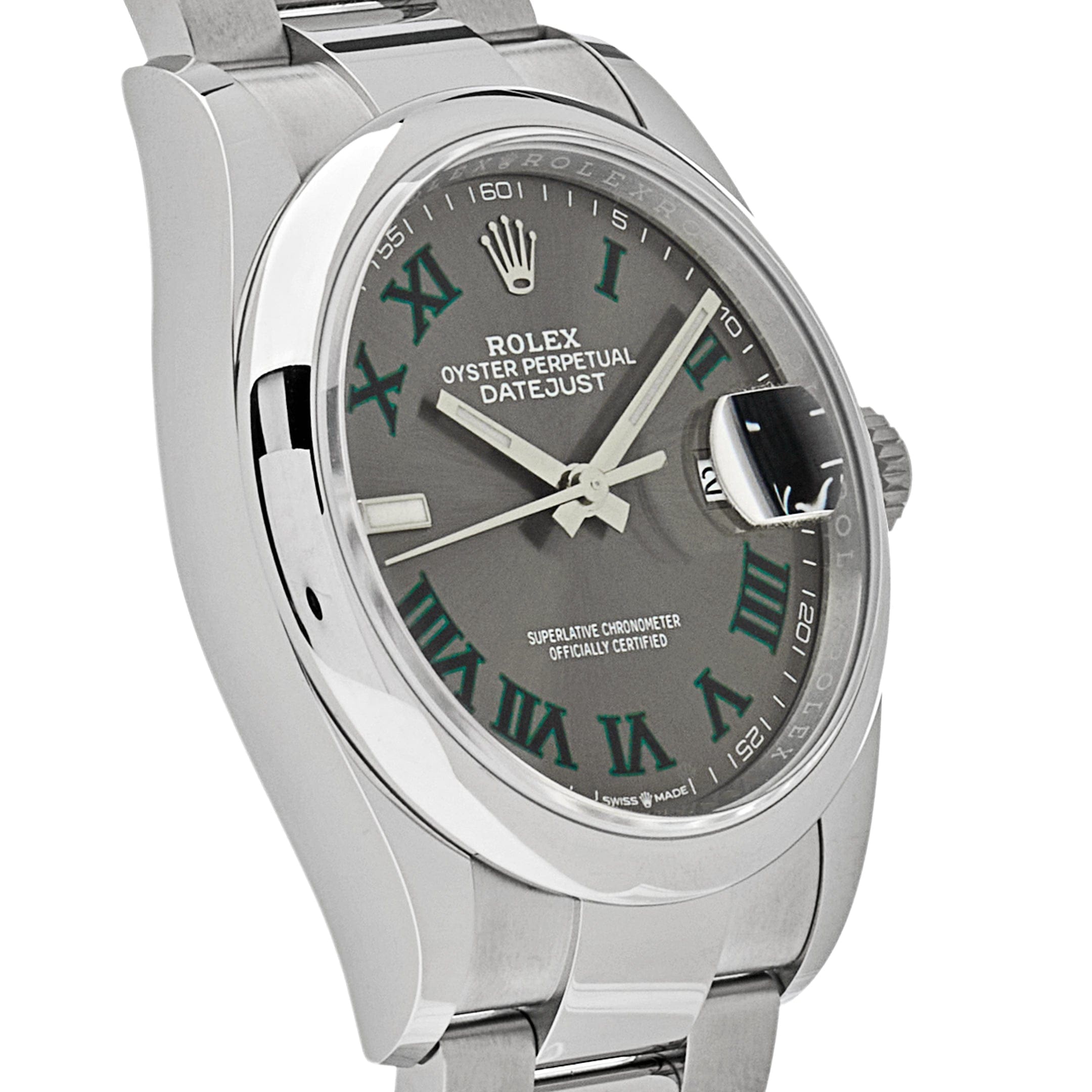This Rolex 126200 is designed with a 36mm stainless steel case and slate dial and styled on an Oyster bracelet. The smooth bezel can be dressed up or down, and with the 3235 caliber, this beauty has 70 hours of power reserve, so you can wear it all day and at any event. Roman numeral hour markers in green are representative of the famous Wimbledon court, a place where luxury and sports are perfectly paired.