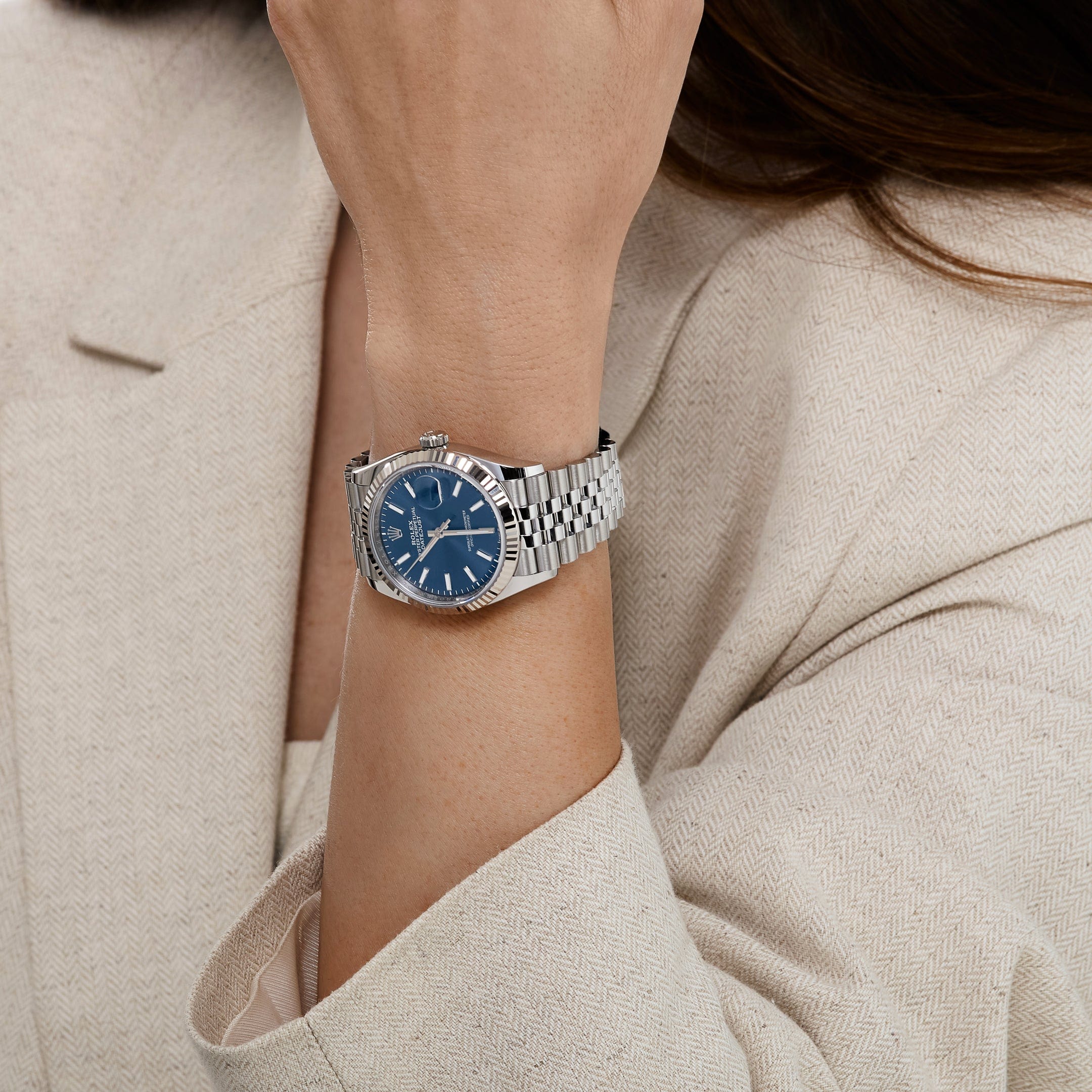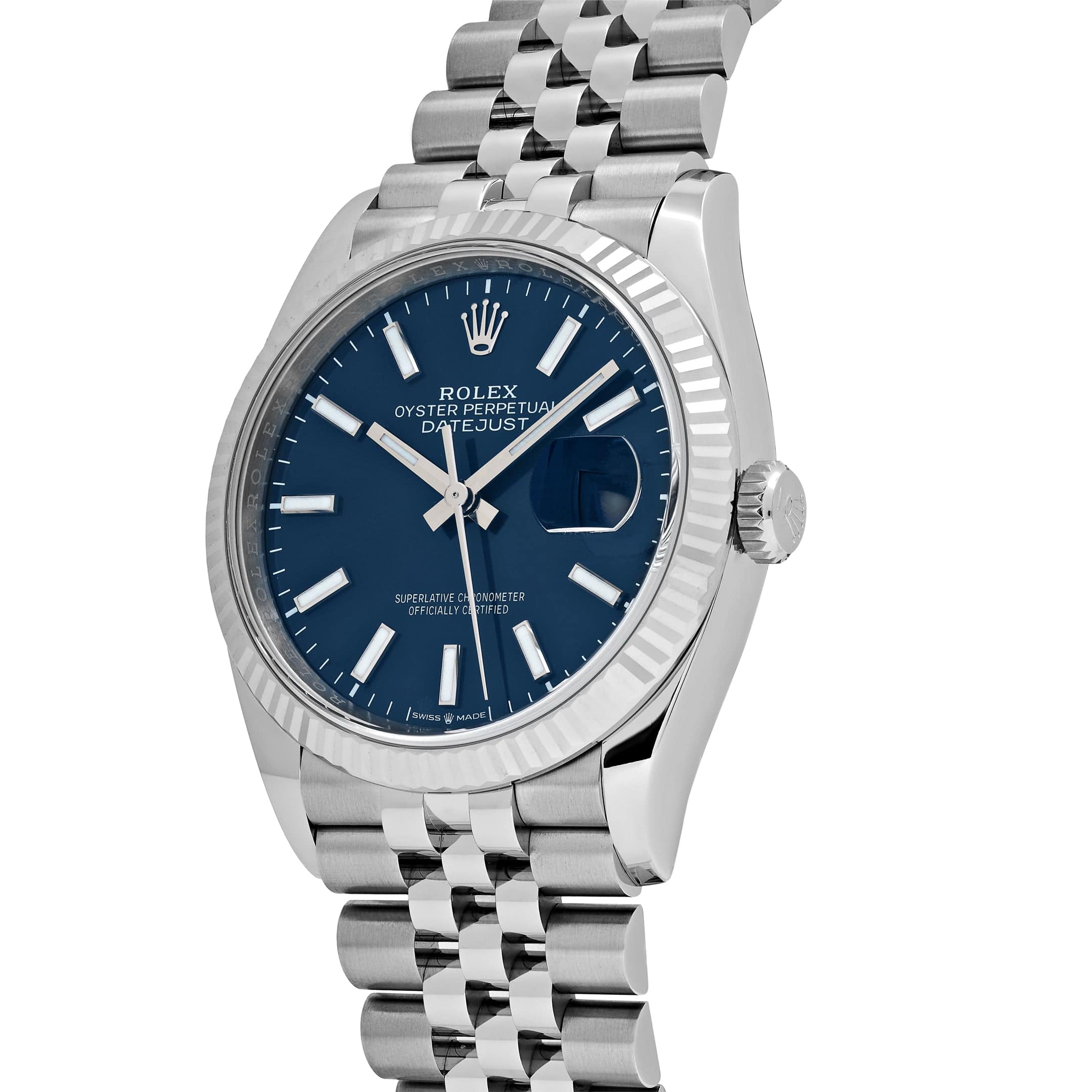 The vibrant sunray blue dial provides a modern touch, featuring white gold hour markers and hands filled with Chromalight for long-lasting luminescence. Paired with the iconic five-link Jubilee bracelet, known for its comfort and fluidity, this reference delivers both sophistication and durability. Powered by the Caliber 3235, Rolex??s latest-generation automatic movement, the 126234 offers 70 hours of power reserve, Superlative Chronometer precision, and a seamless date change via the Cyclops magnifier at 3 o??clock. As one of the most balanced and sought-after configurations in the Datejust line, this watch bridges classic Rolex heritage with a vibrant, contemporary edge.