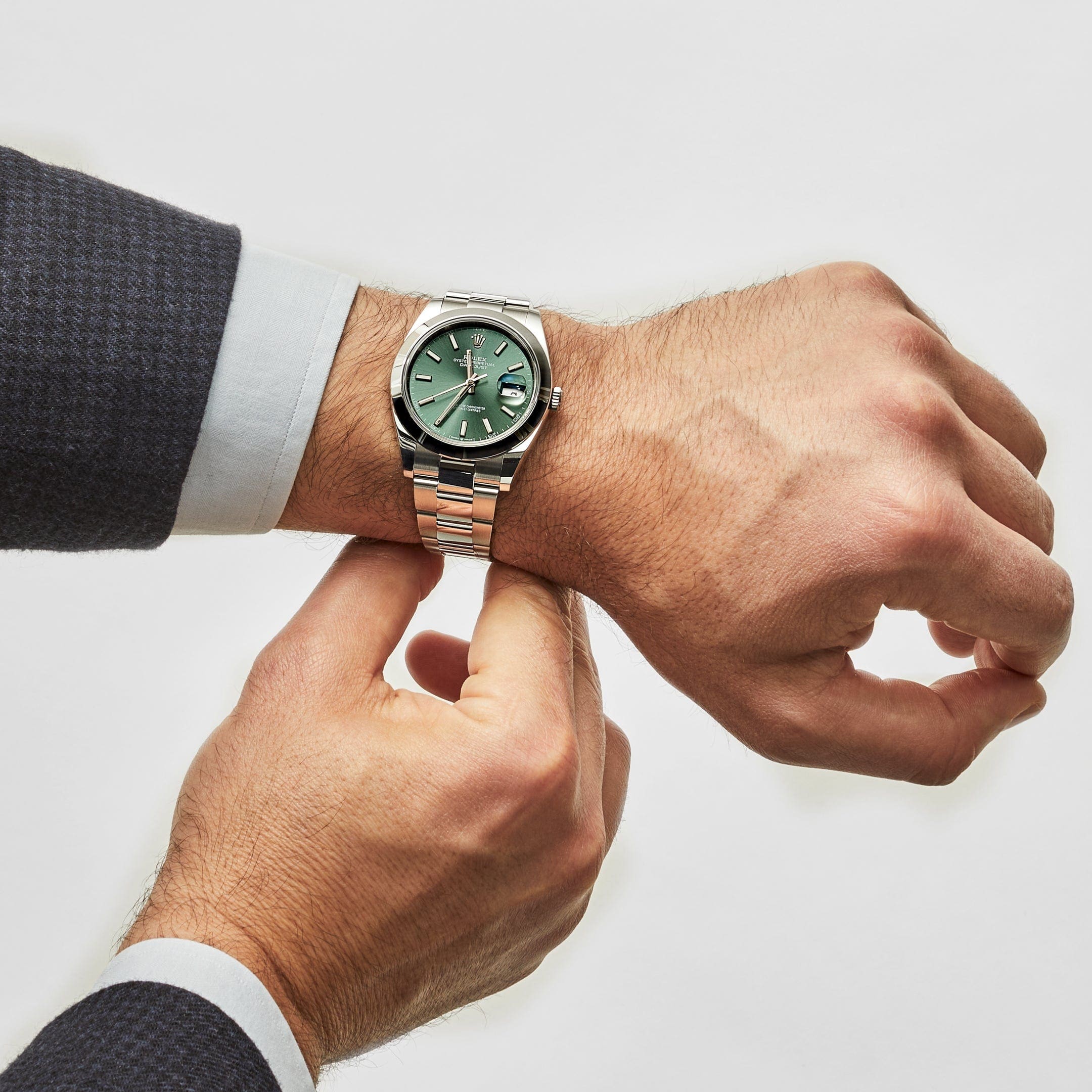 The striking green dial serves as the centerpiece, enhanced by white baton hour markers filled with Chromalight for optimal visibility in any lighting condition. The date window at 3 o??clock, magnified by the signature Cyclops lens, adds practicality while maintaining the balanced aesthetic of the dial.