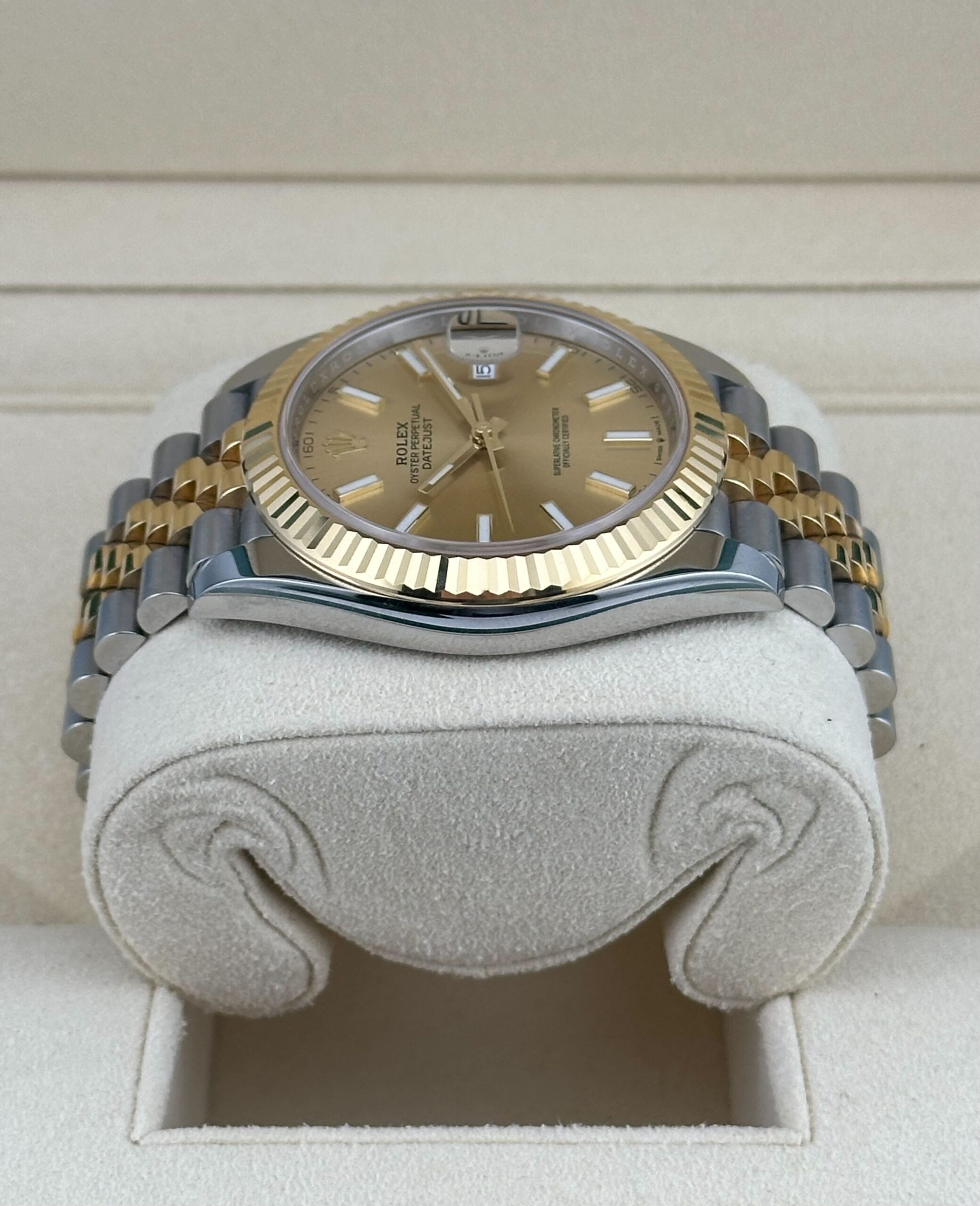 The Rolex is designed with a 41mm stainless steel case, highlighted by the signature 18k yellow gold fluted bezel. It features an elegant champagne color dial with luminous hour markers and white gold hands with a date display at 3 o’clock, protected by a scratch-resistant sapphire-crystal. On the wrist the 18k white gold and stainless steel jubilee bracelet is a true beauty.