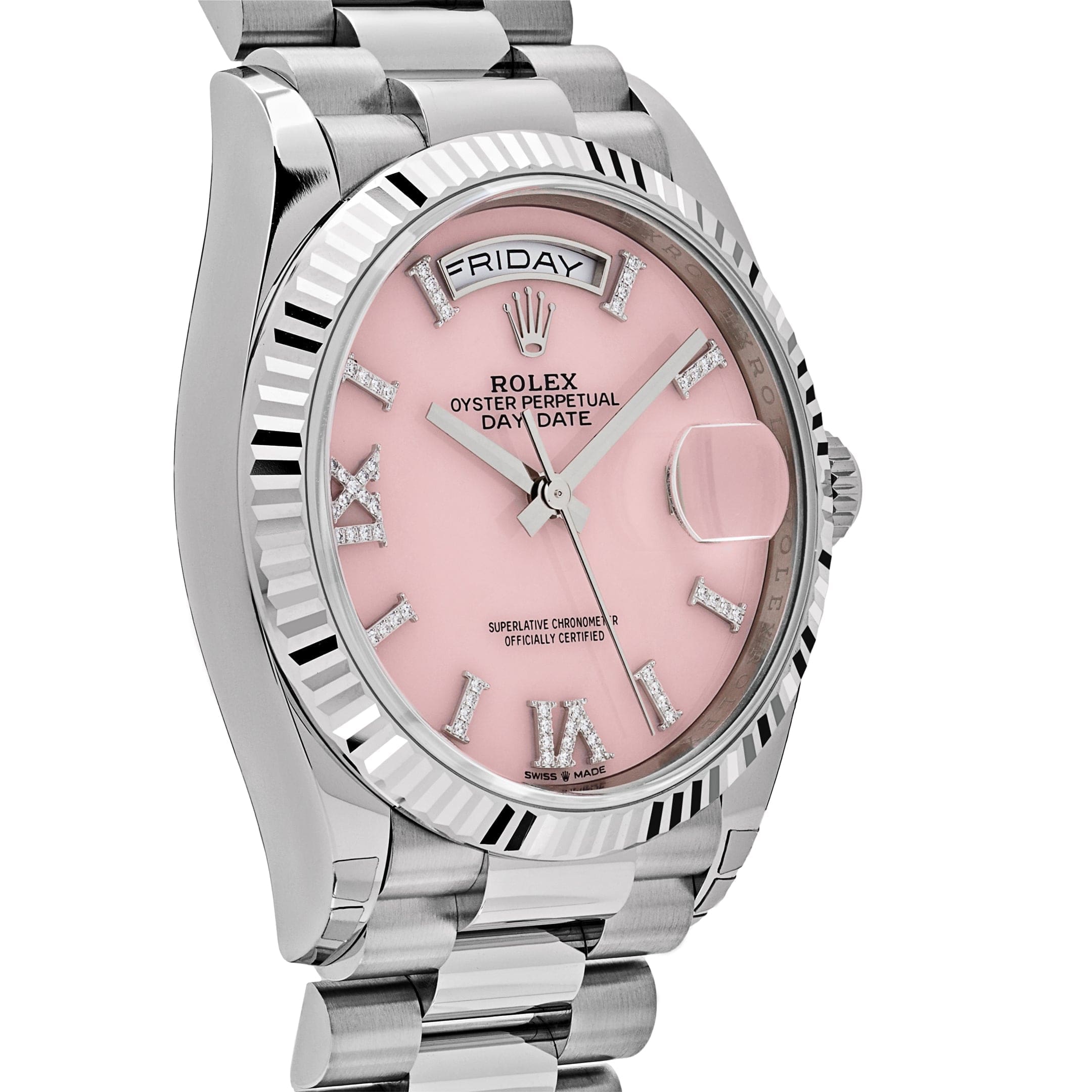 Rolex Day-Date 36 128239 White Gold Pink Opal Diamond Roman Numerals Dial