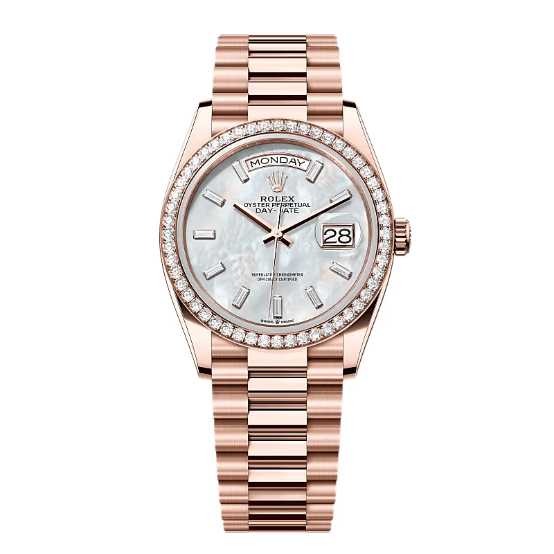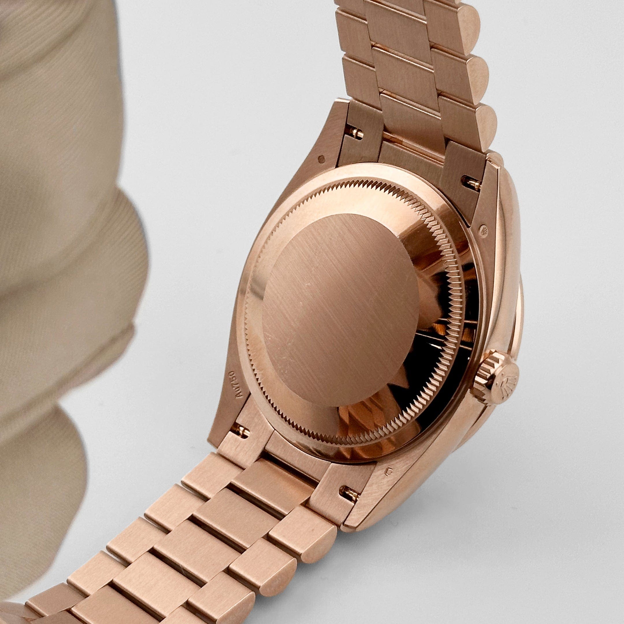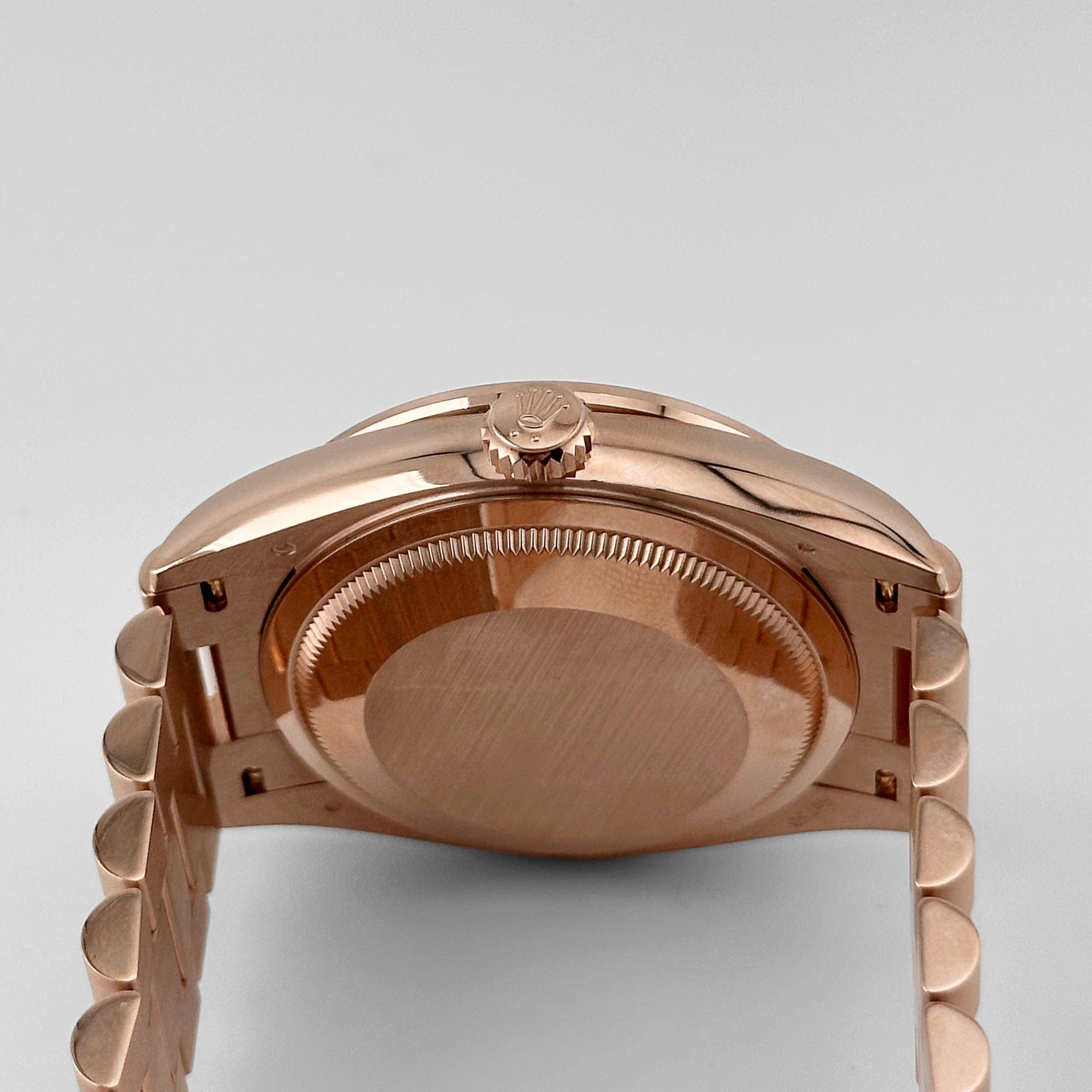 As part of the iconic Day-Date collection, this timepiece features the day display at 12 o??clock and the date window at 3 o??clock, both magnified by Rolex??s Cyclops lens for enhanced legibility. Paired with the prestigious President bracelet, also crafted in Everose gold, known for its polished three-link design and exceptional comfort, the Day-Date 128345RBR is the ultimate expression of refinement.