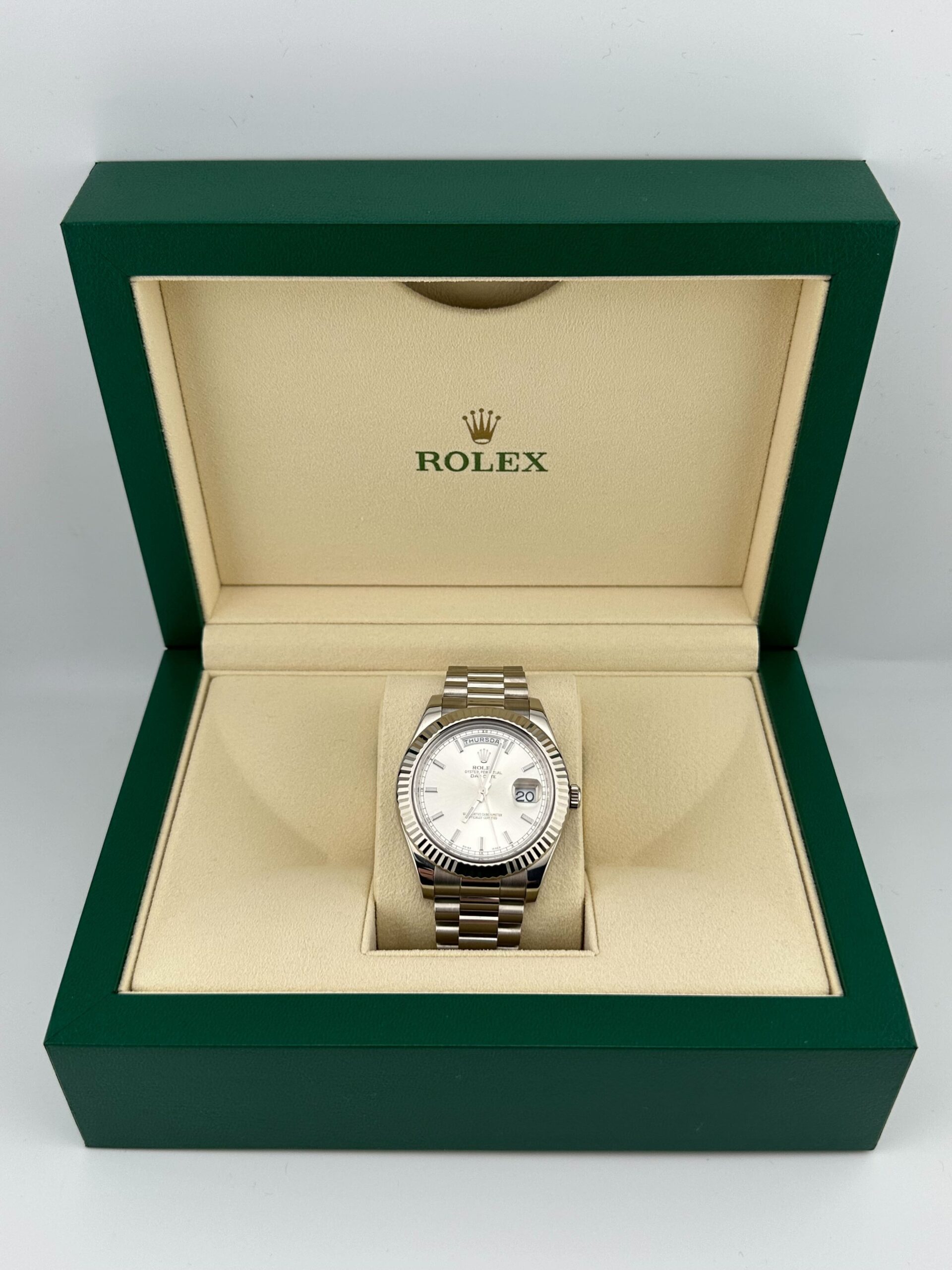The Rolex II 218239 is a commanding timepiece that combines timeless design with luxurious craftsmanship. Crafted in 18k white gold, the 41mm case exudes both elegance and presence, while the signature fluted bezel adds a touch of refinement unique to Rolex??s Day-Date collection.