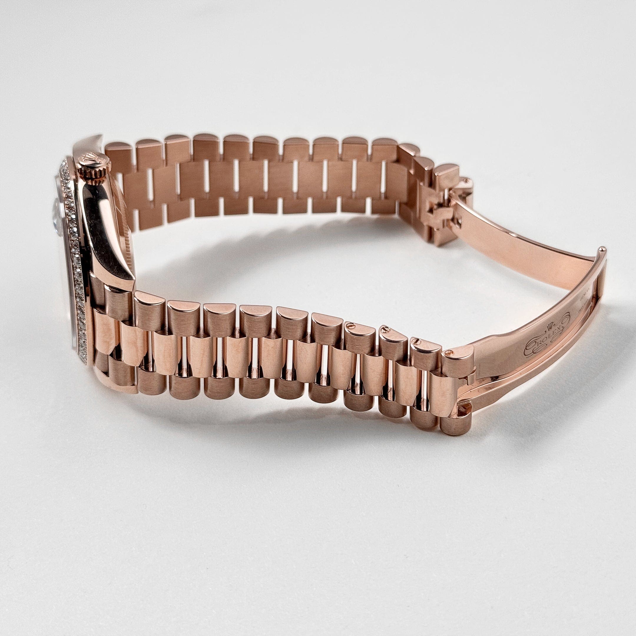 The Rolex 228345RBR is a breathtaking timepiece that combines luxurious materials with exquisite craftsmanship. Crafted in 18k rose gold, its 40mm case radiates warmth and elegance, further elevated by a dazzling diamond-set bezel, which adds a touch of brilliance to this iconic design.
