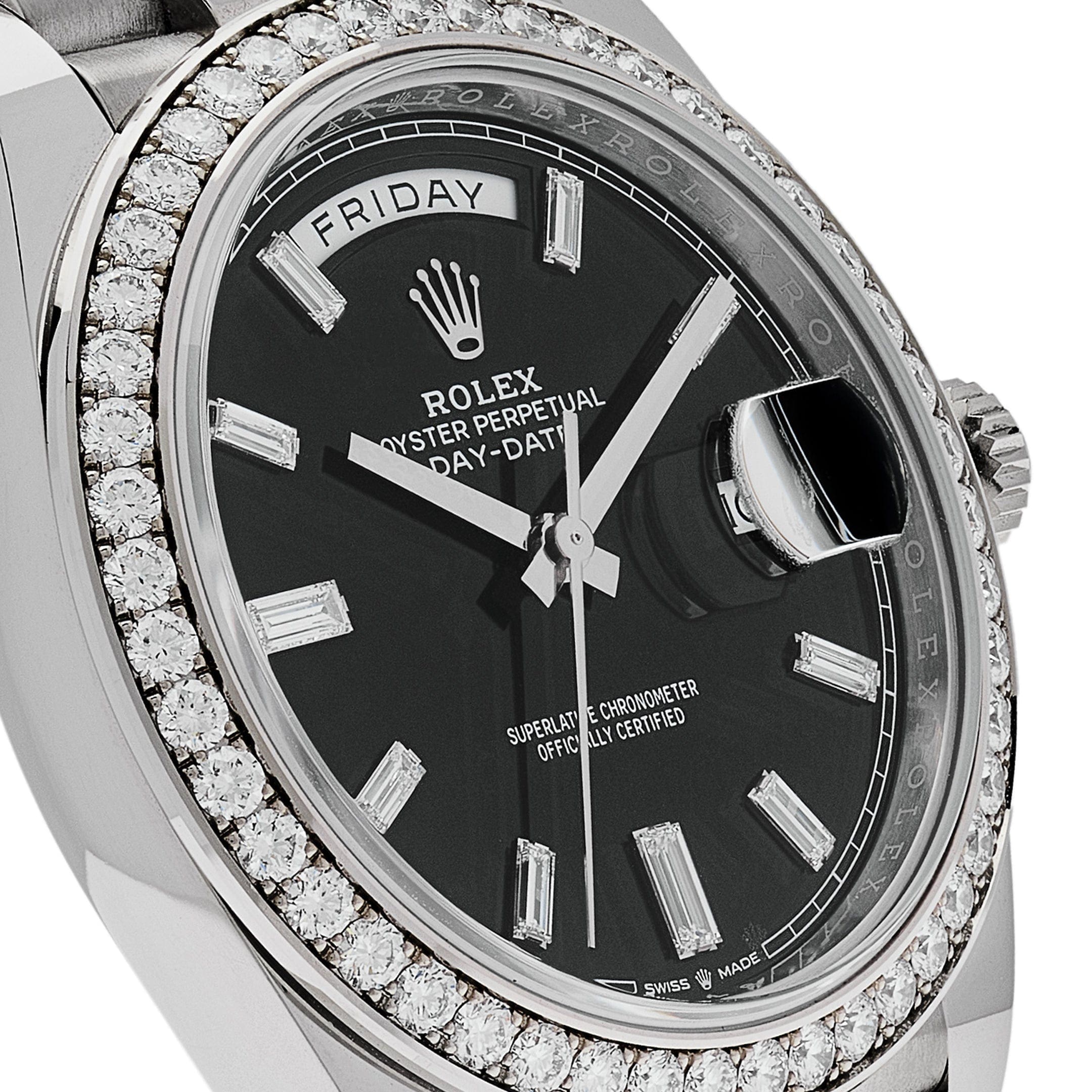 The Rolex 40 reference 228349RBR is a timeless icon, crafted in 18k white gold and adorned with a diamond-set bezel. Its bold black dial serves as the perfect contrast to the brilliance of the bezel, featuring applied white gold hour markers and the Day-Date??s signature day and date apertures at 12 and 3 o??clock.The 40mm case offers a refined presence, while the integrated President bracelet, also in white gold, ensures both comfort and prestige.