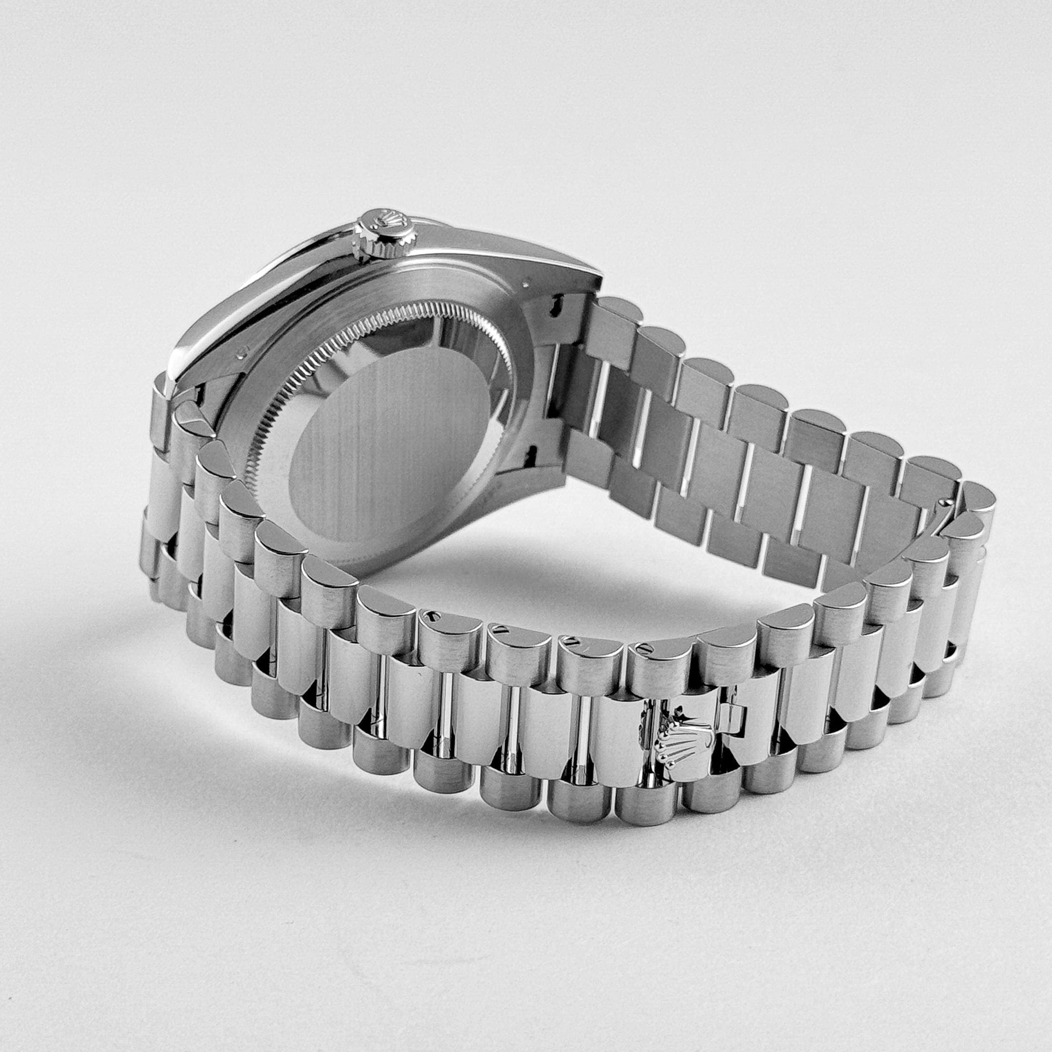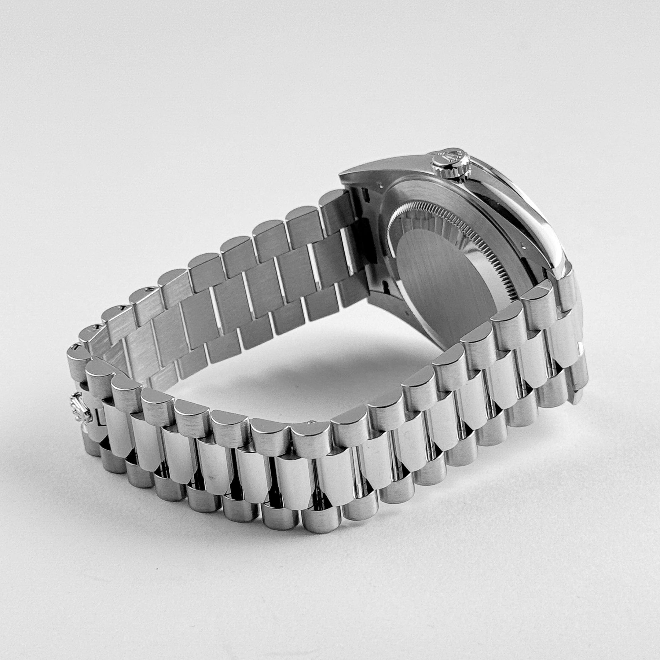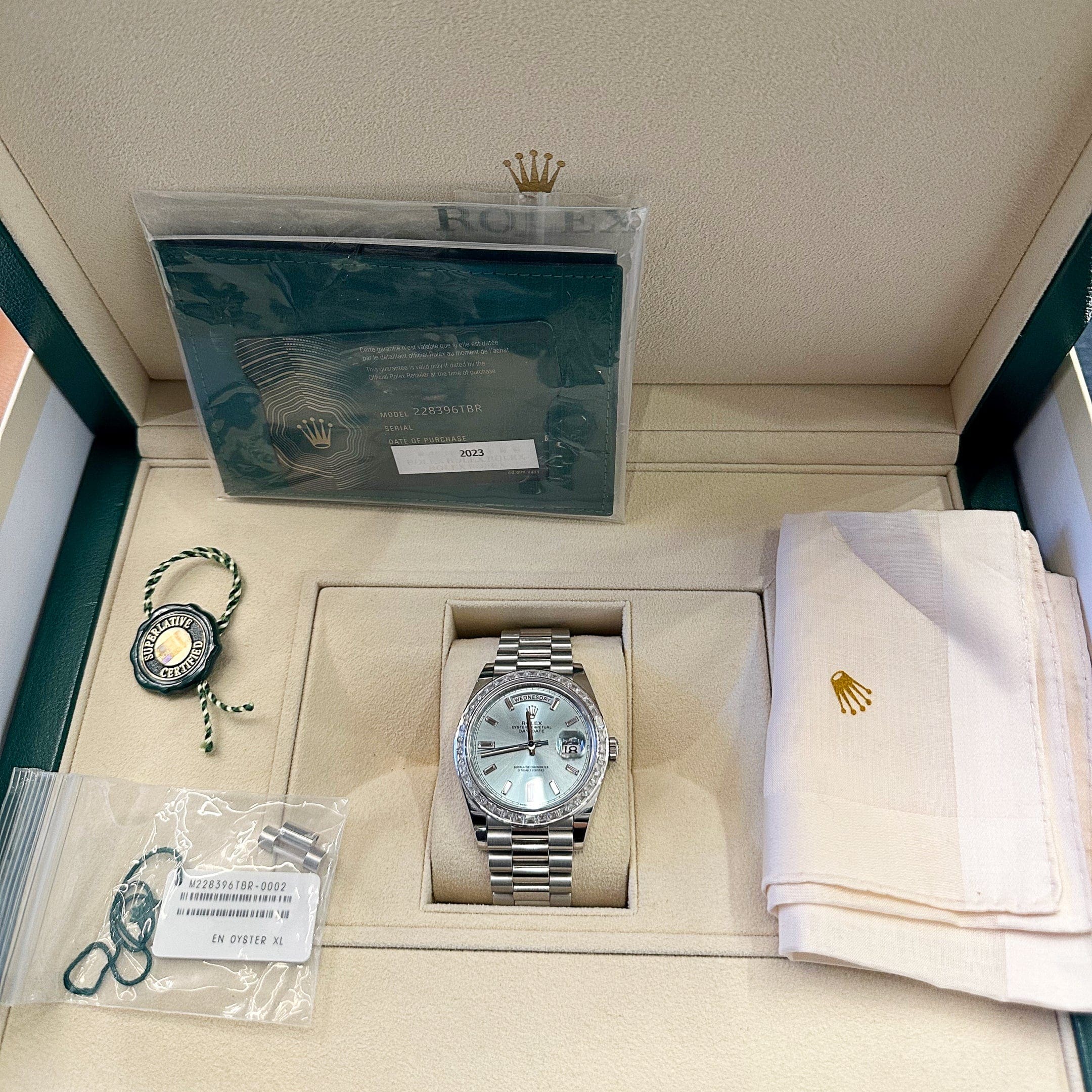 The Rolex 228396TBR epitomizes prestige and luxury. Crafted from platinum, the 40mm Oyster case radiates exclusivity, complemented by a diamond-set bezel that amplifies its brilliance. Paired with the signature President bracelet, this timepiece ensures both comfort and elegance.