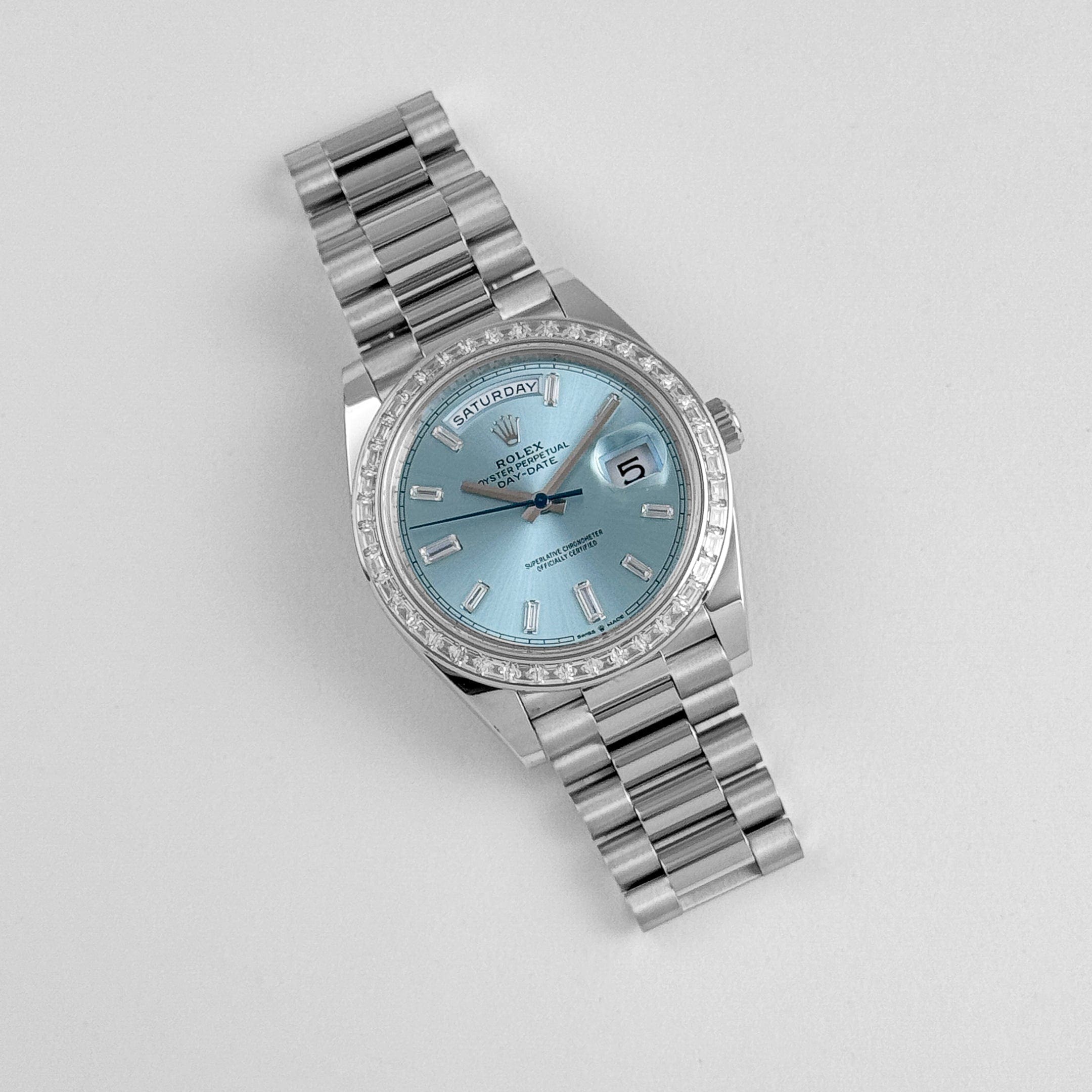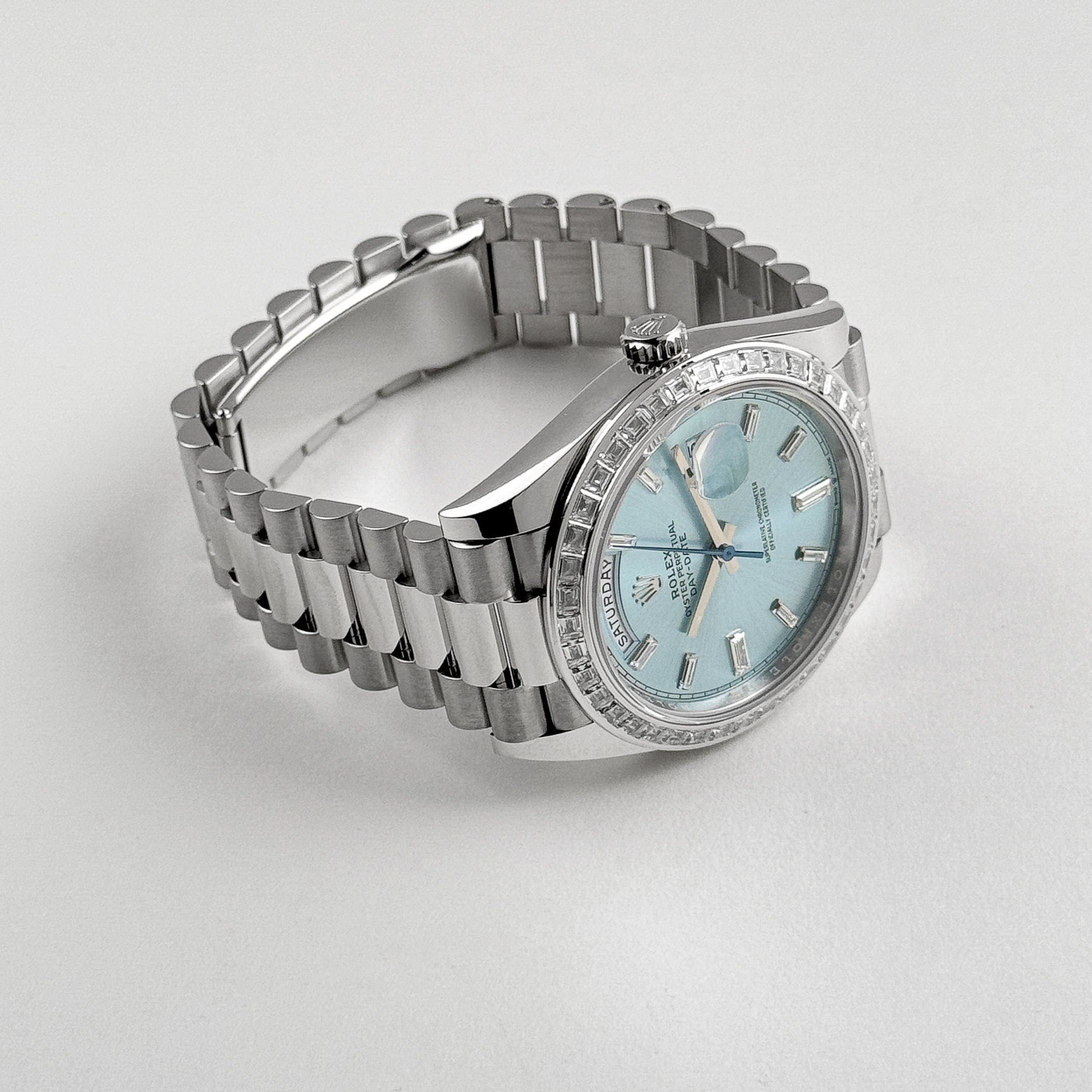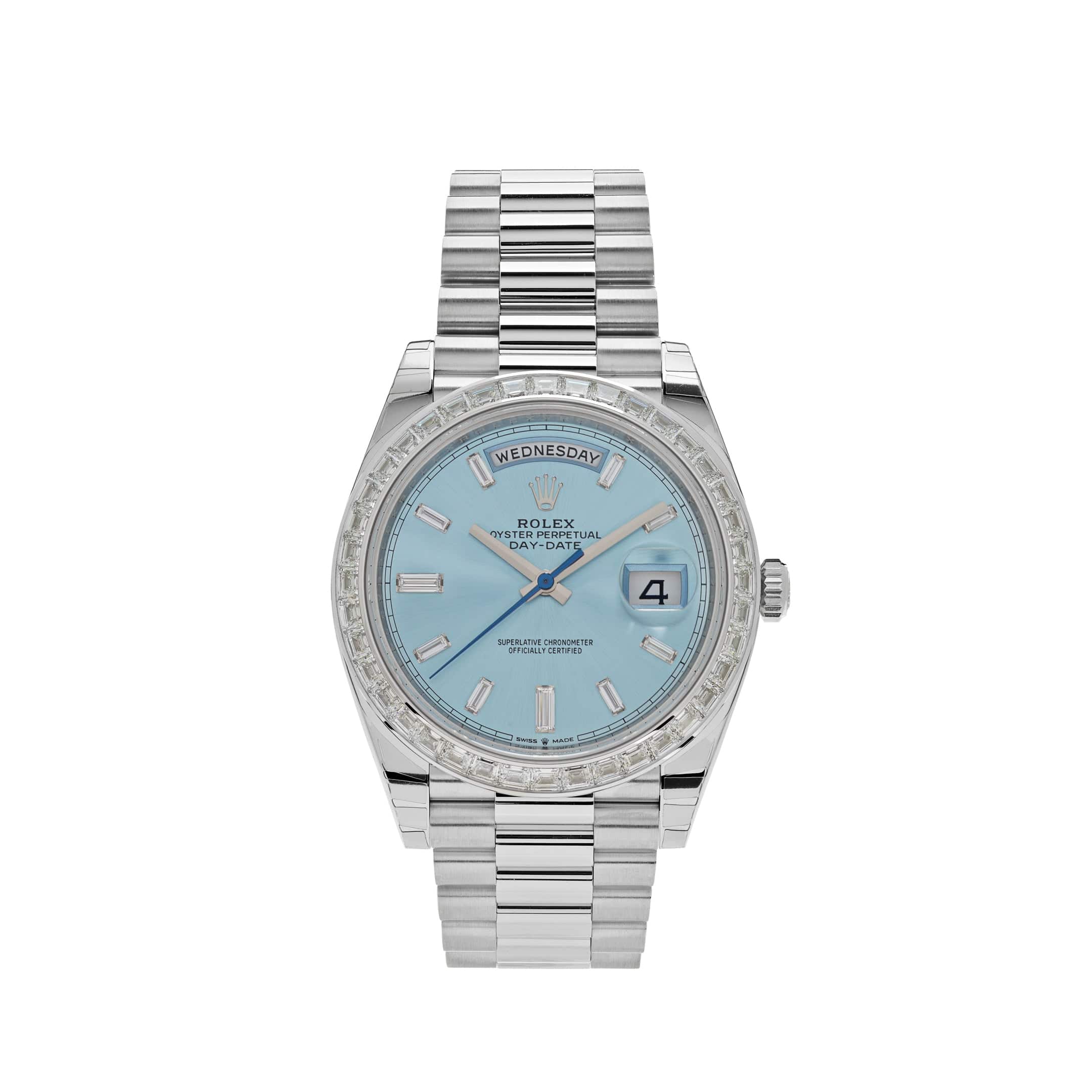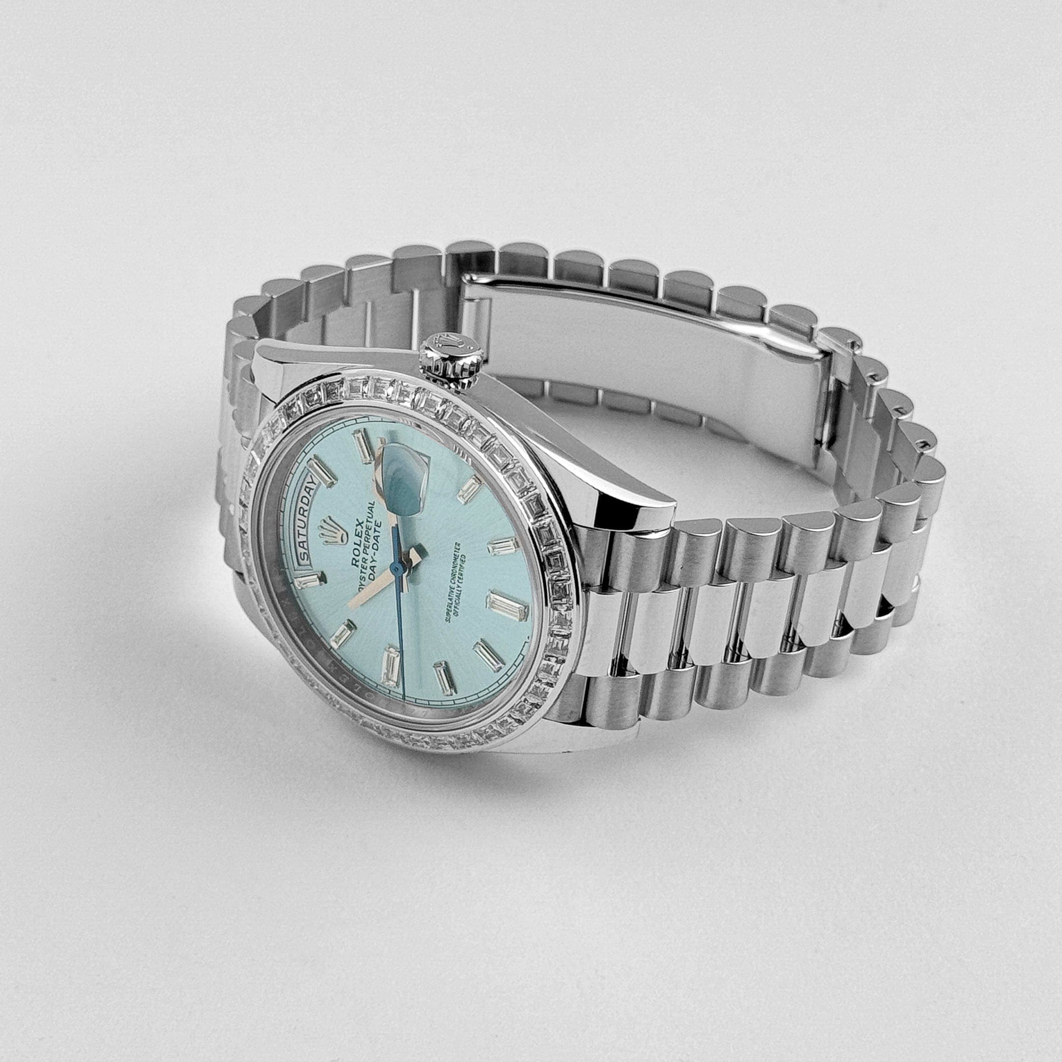 The standout feature is the mesmerizing ice blue dial, exclusive to Rolex platinum models, adorned with brilliant-cut diamond hour markers. The day window at 12 o??clock and date display at 3 o??clock seamlessly integrate functionality into the sophisticated design.