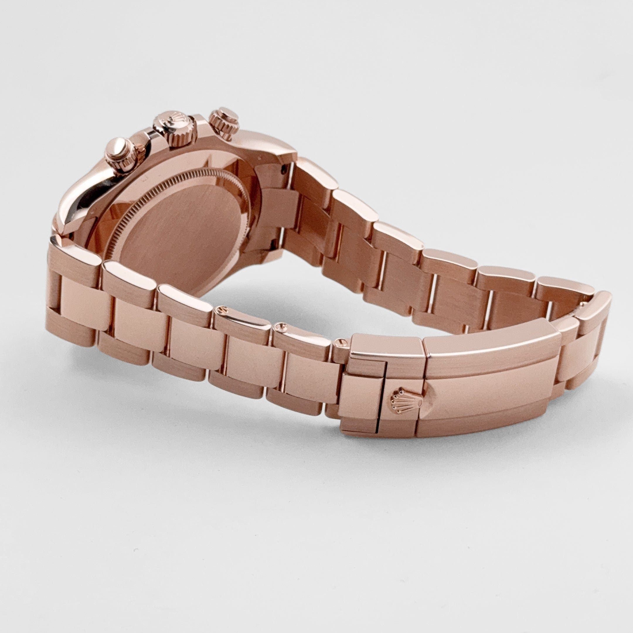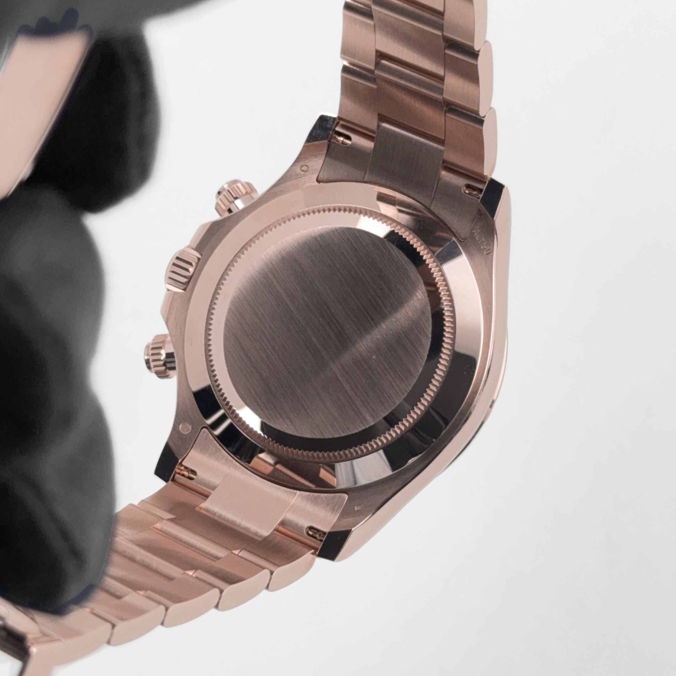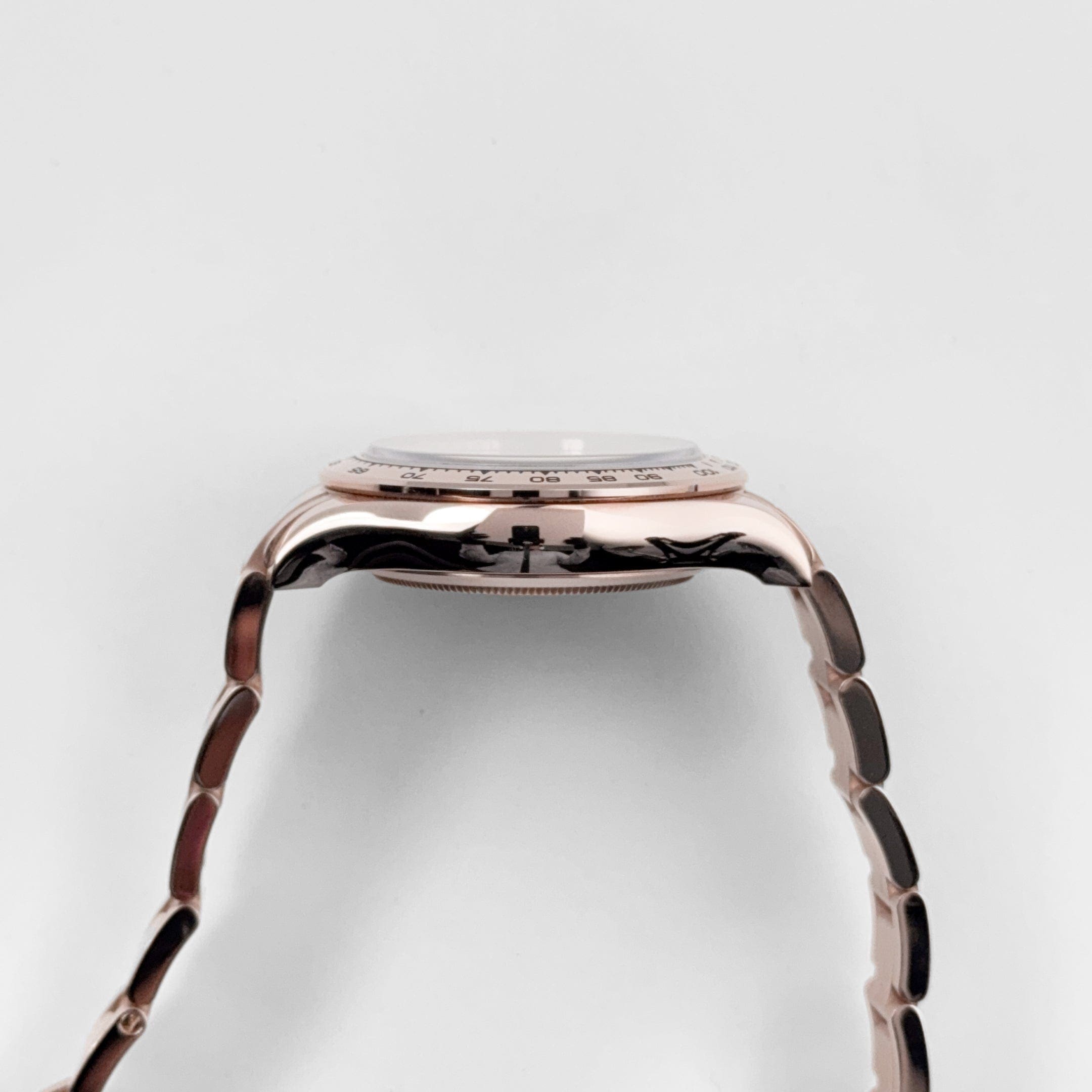 The Rolex 116505 combines cutting-edge functionality with opulent design, making it a standout chronograph for collectors. The 40mm Oyster case, crafted from 18k Everose gold, is paired with a matching tachymeter-engraved bezel, embodying both luxury and motorsport-inspired precision.