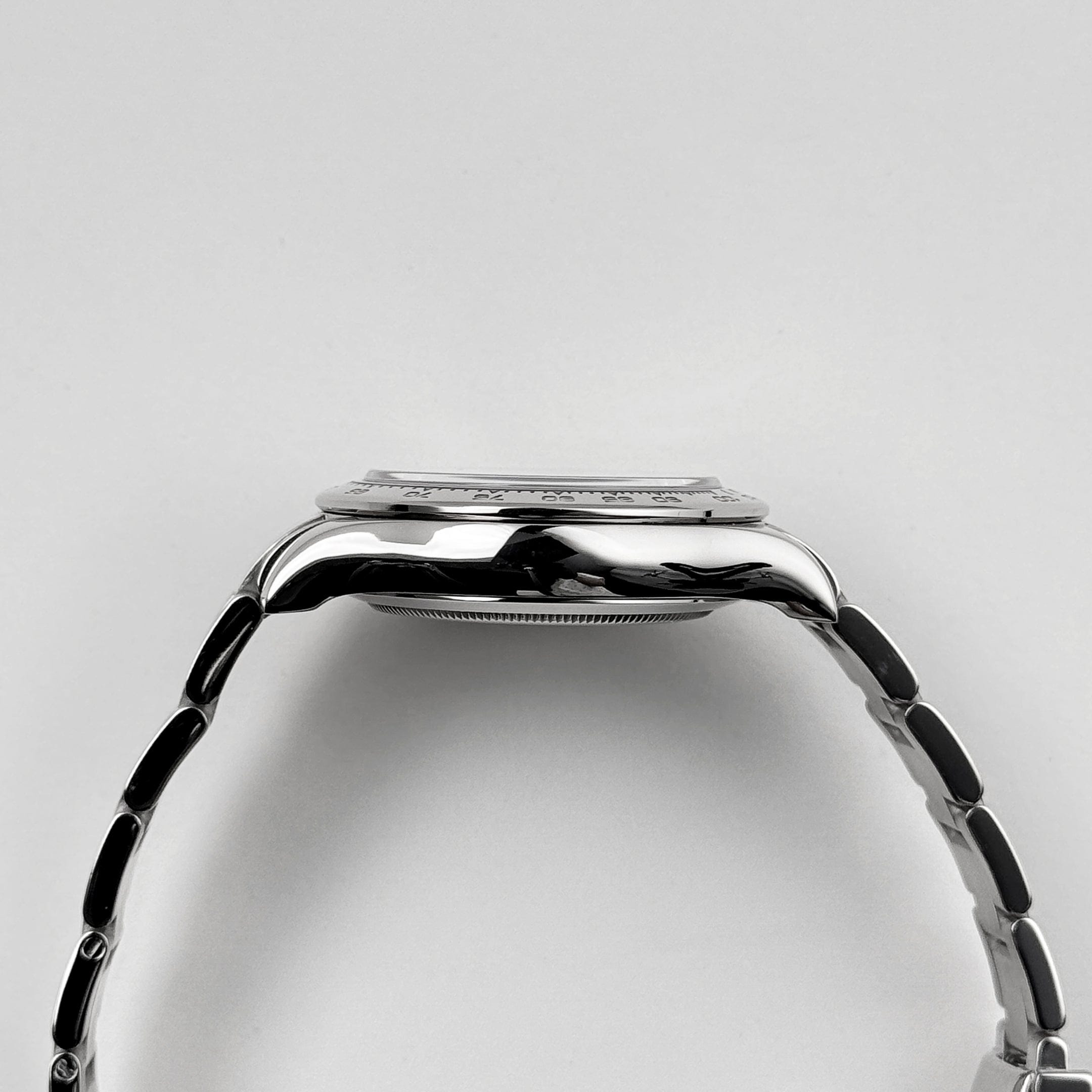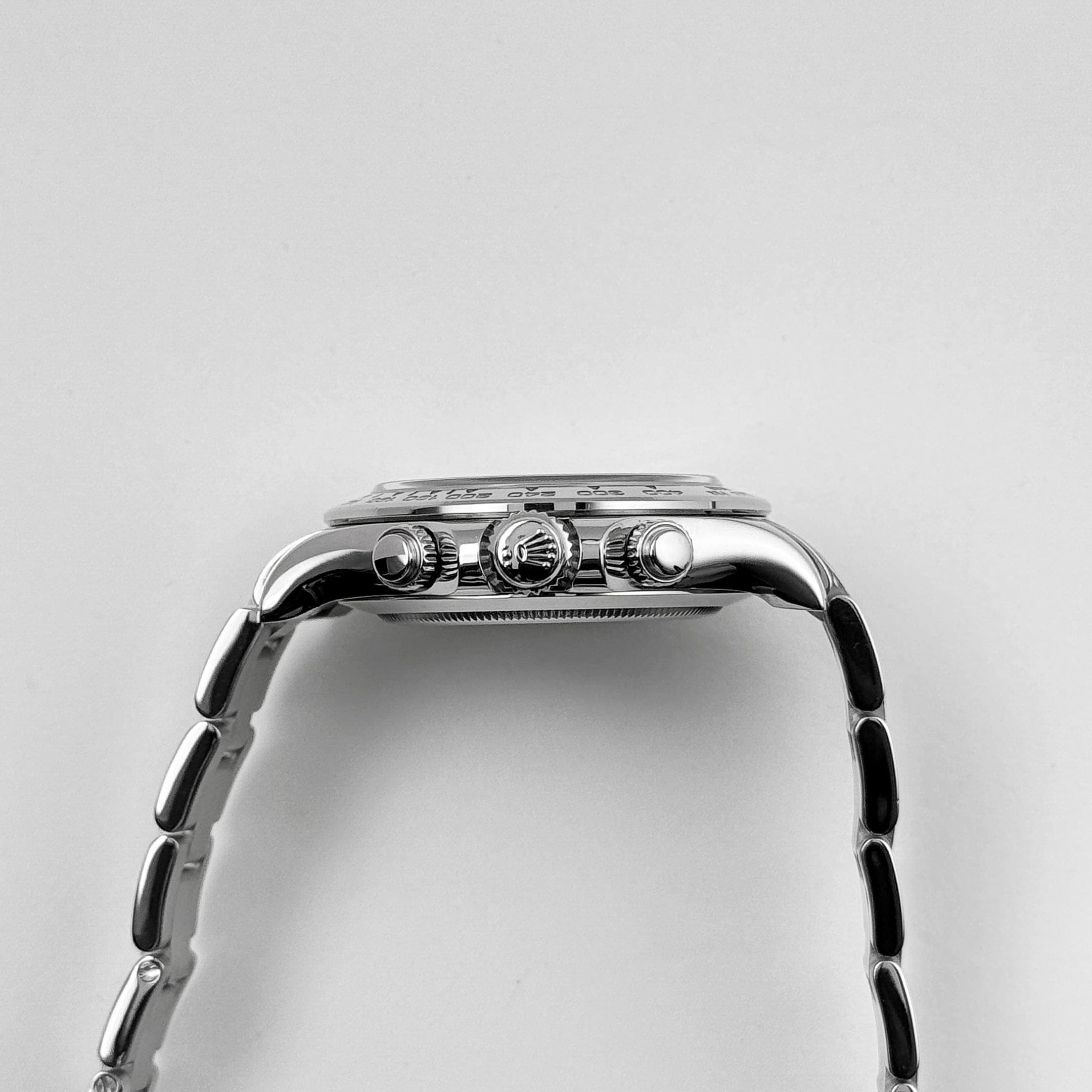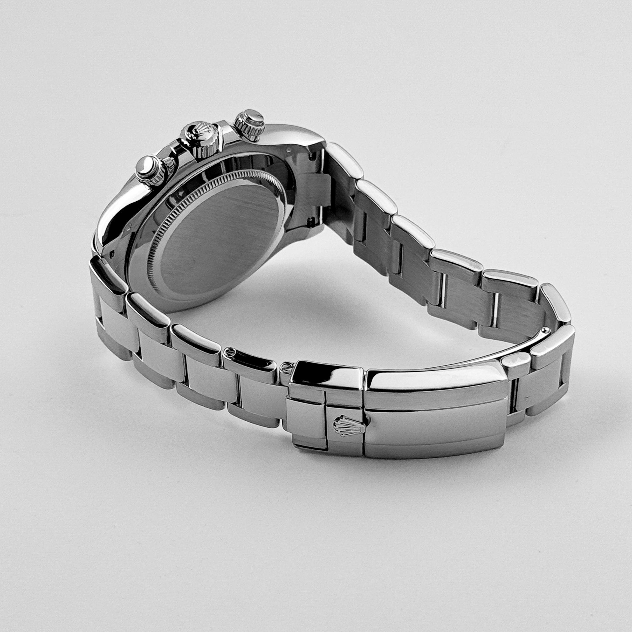 The Rolex 116509 is a striking chronograph that seamlessly blends luxury and performance. Its 40mm case, crafted from 18k white gold, exudes refinement and durability. The polished bezel features an engraved tachymeter scale, emphasizing the Daytona’s motorsport heritage.