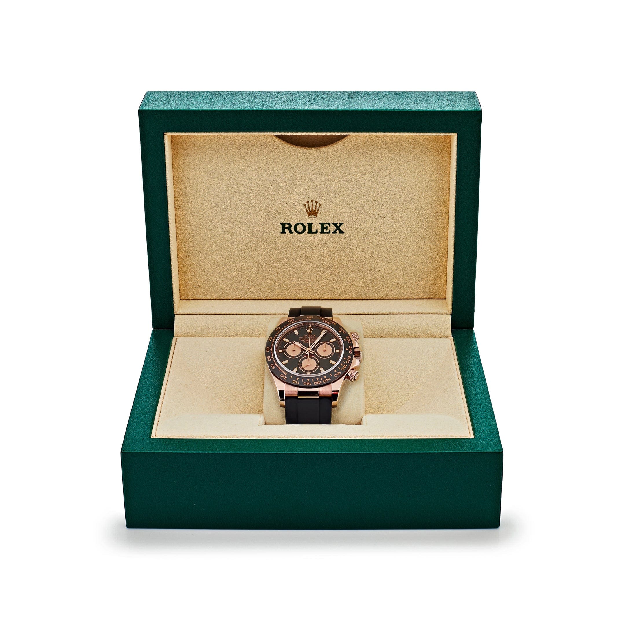 The Rolex 116515LN is a refined chronograph that blends luxurious materials with a sporty edge. Its 40mm 18k Everose gold case is paired with a sleek Cerachrom bezel featuring an engraved tachymeter scale, ideal for precision timing and paying homage to the Daytona’s motorsport heritage.