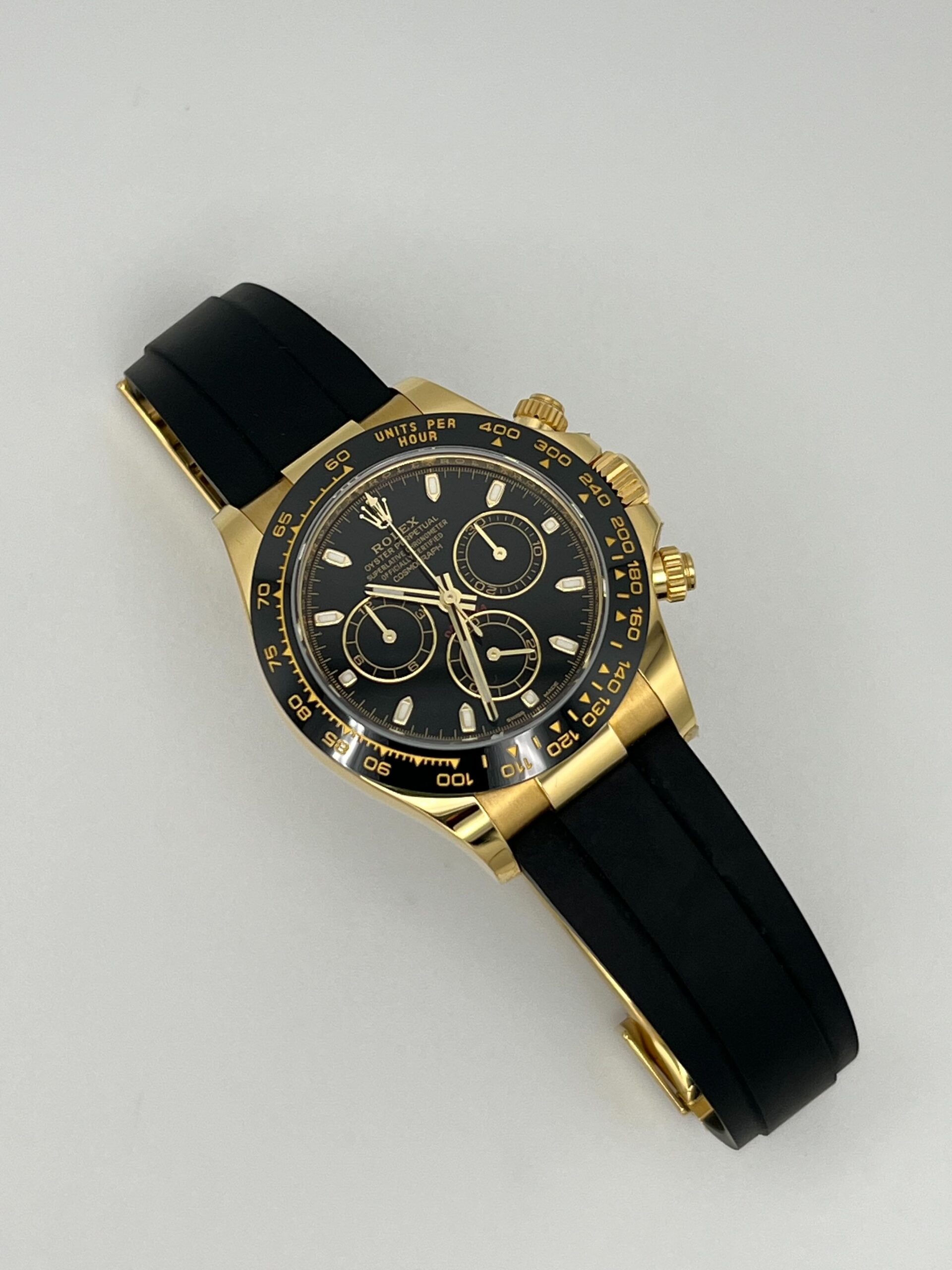This Rolex 116518LN is designed in a 40mm 18k yellow gold case, a black bezel featuring a Tachymetric scale, and a black dial with matching sub-dials. The hour markers and hands work with Chromalight display to provide optimal legibility. It is housed on a black rubber strap with a folding clasp. Discover the pinnacle between form, function, and fashion.