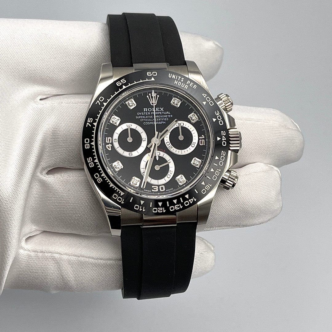 The Rolex 116519LN is a luxurious and sporty chronograph, crafted in 18k white gold for a refined and elegant appearance. Its 40mm case is complemented by a sleek black Cerachrom bezel, engraved with a tachymeter scale, reflecting the Daytona??s rich motorsport heritage. The striking black dial is adorned with factory-set diamond hour markers, adding a touch of brilliance to its bold design.
