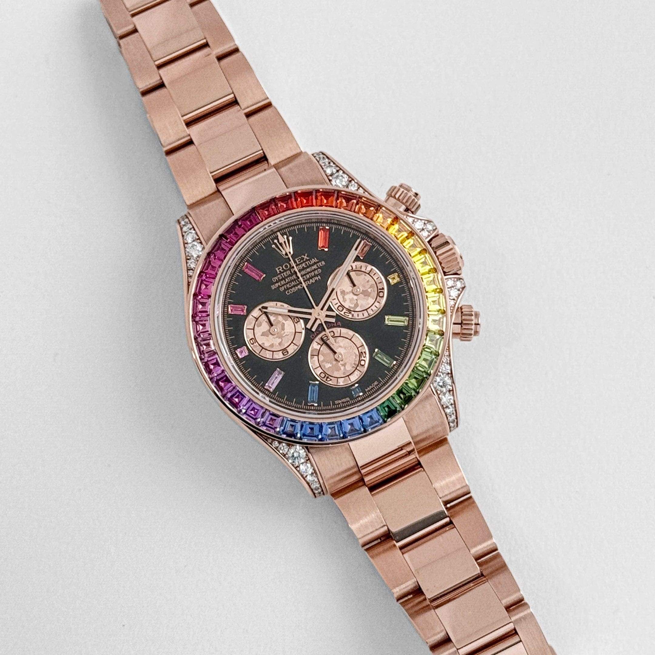 The?Rolex 116595RBOW “Rainbow”?is a breathtaking fusion of haute horology and high jewelry, transforming Rolex??s iconic chronograph into a dazzling statement piece. Crafted in?18k Everose gold, its?40mm case?is adorned with a mesmerizing?rainbow-colored sapphire bezel, meticulously set with a gradient of baguette-cut sapphires. The lugs and crown guards are further enhanced with brilliant-cut diamonds, adding an extra layer of brilliance to this already exceptional timepiece.