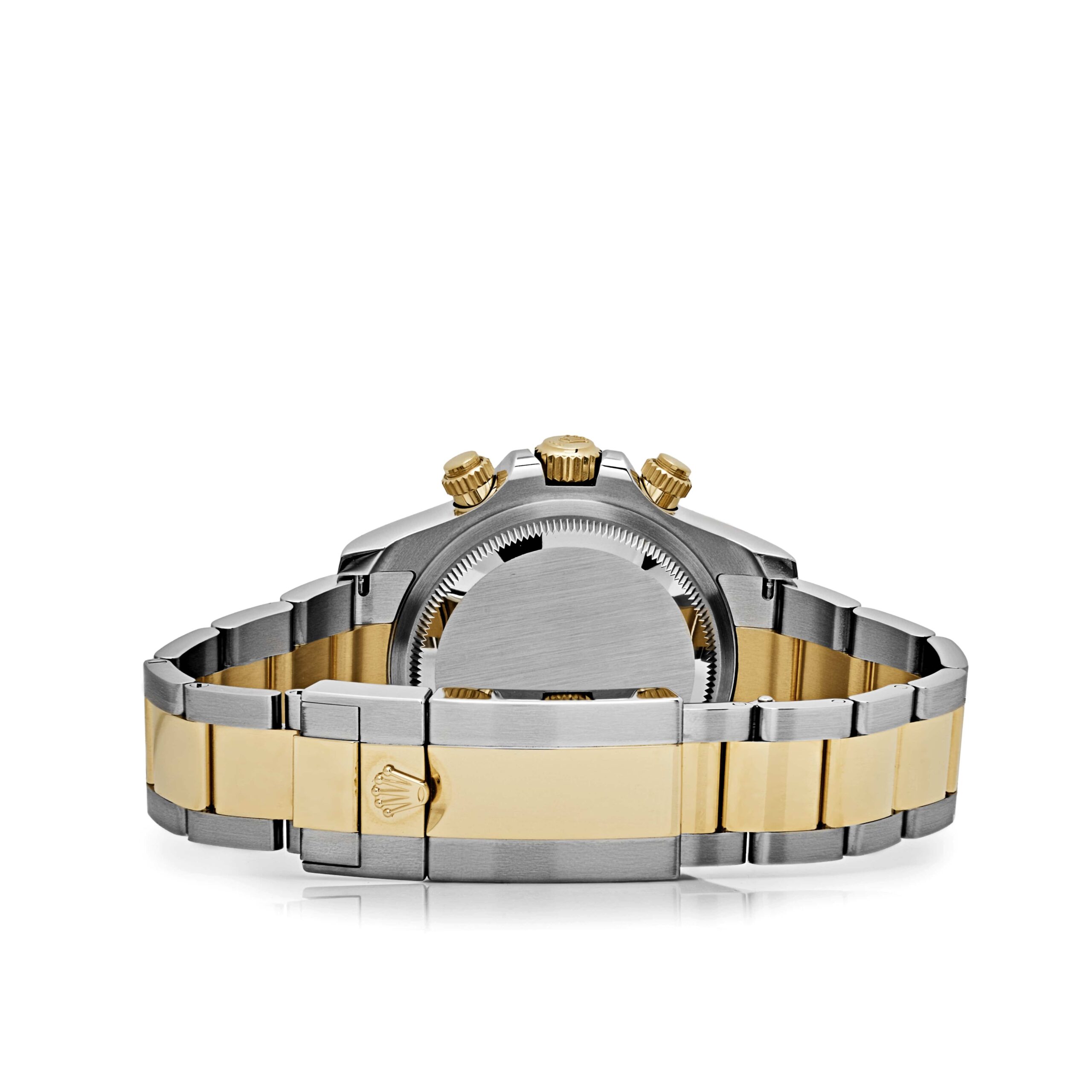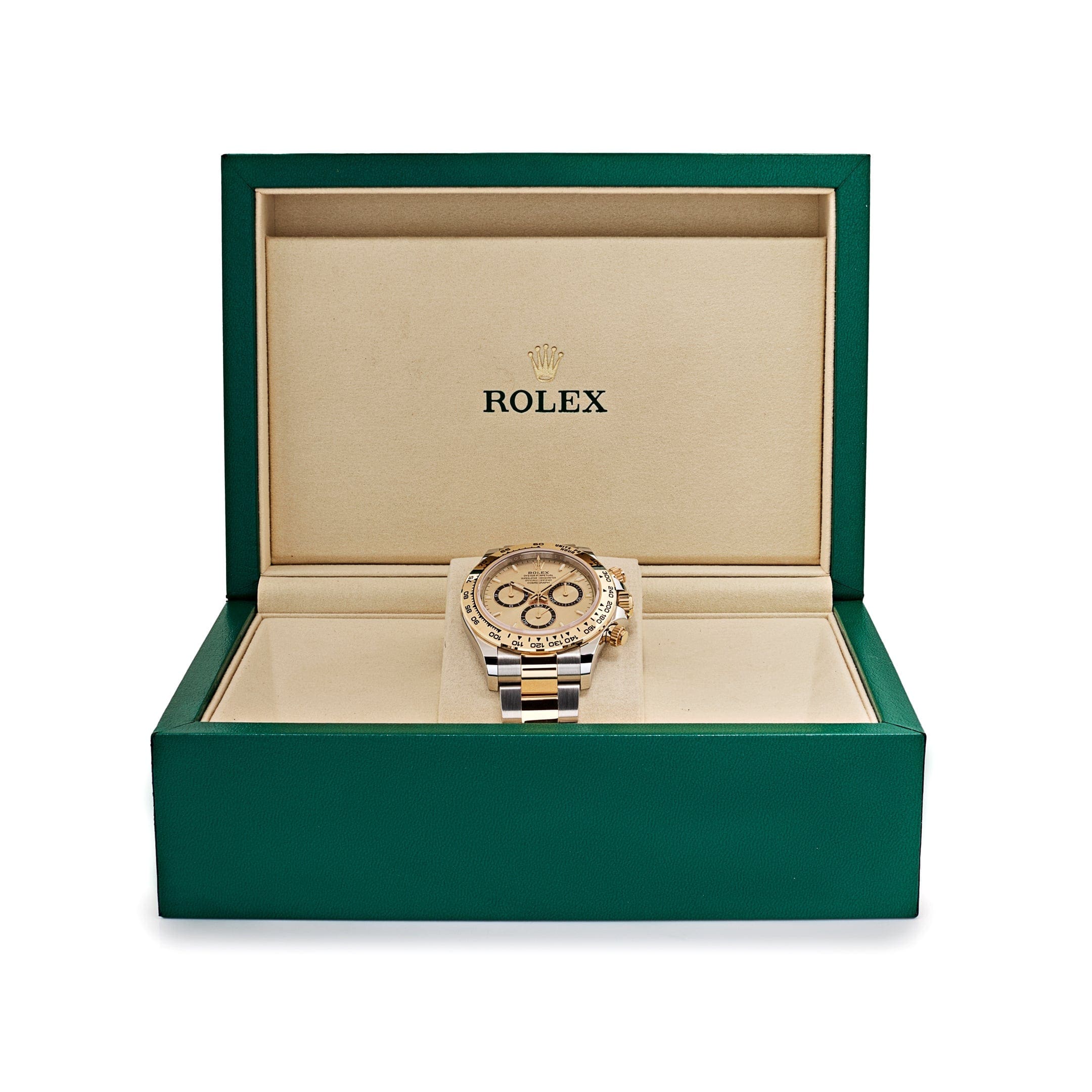 The Rolex 126503 blends the elegance of yellow gold with the durability of stainless steel in a stunning two-tone design. Its 40mm Oyster case features a yellow gold bezel engraved with a tachymeter scale, highlighting the Daytona??s motorsport heritage. The champagne dial provides a luxurious backdrop for the chronograph??s trio of subdials, with luminous hour markers and hands ensuring excellent readability.