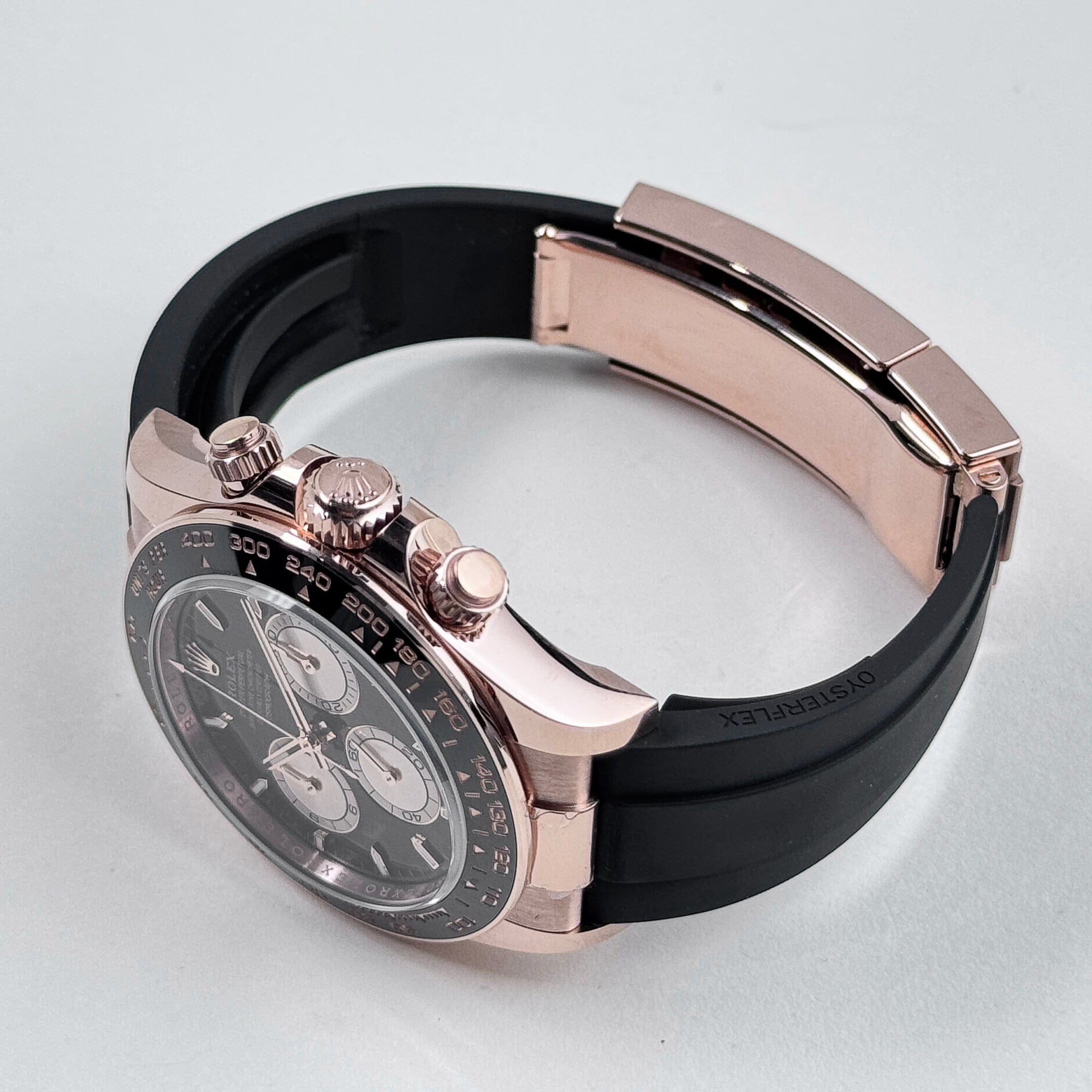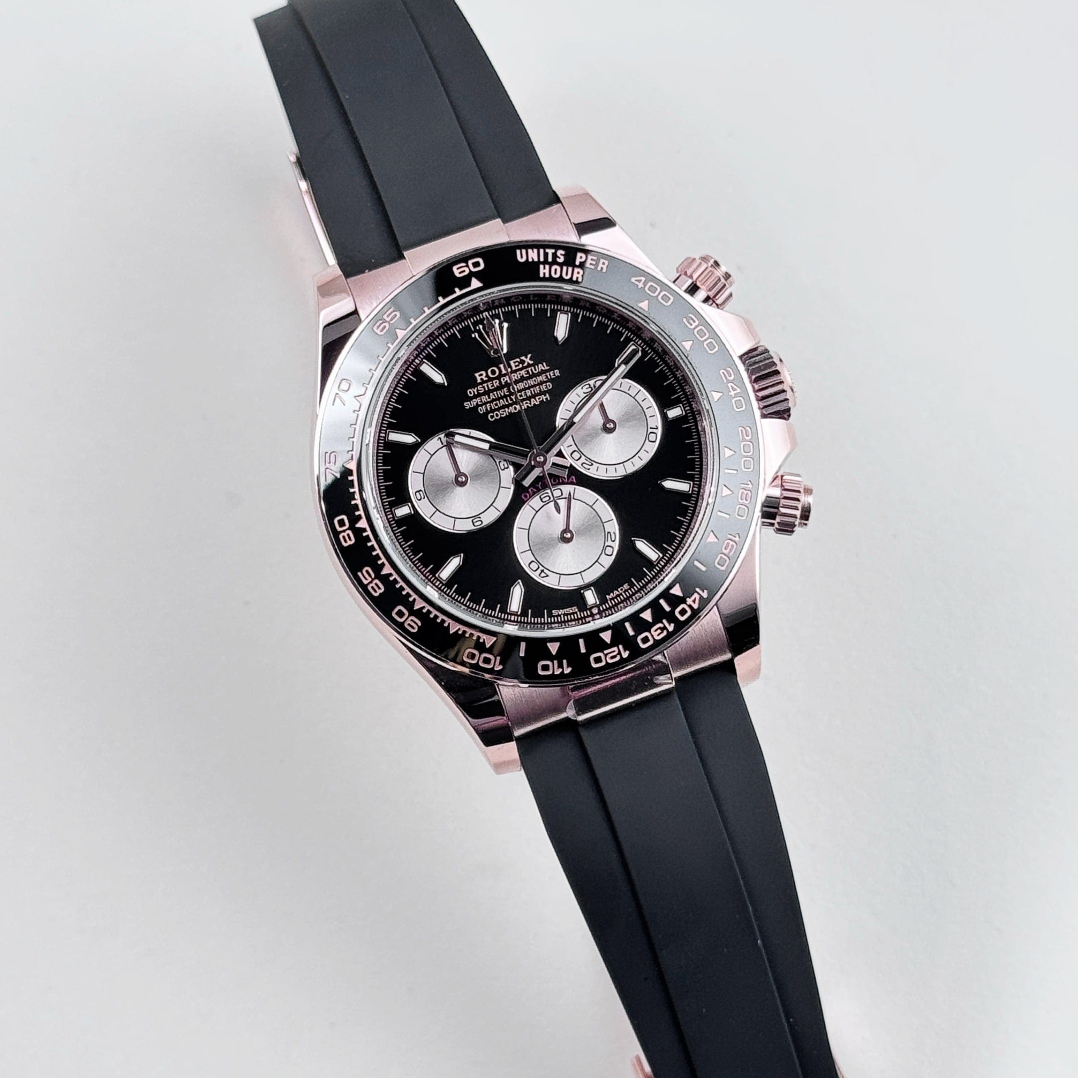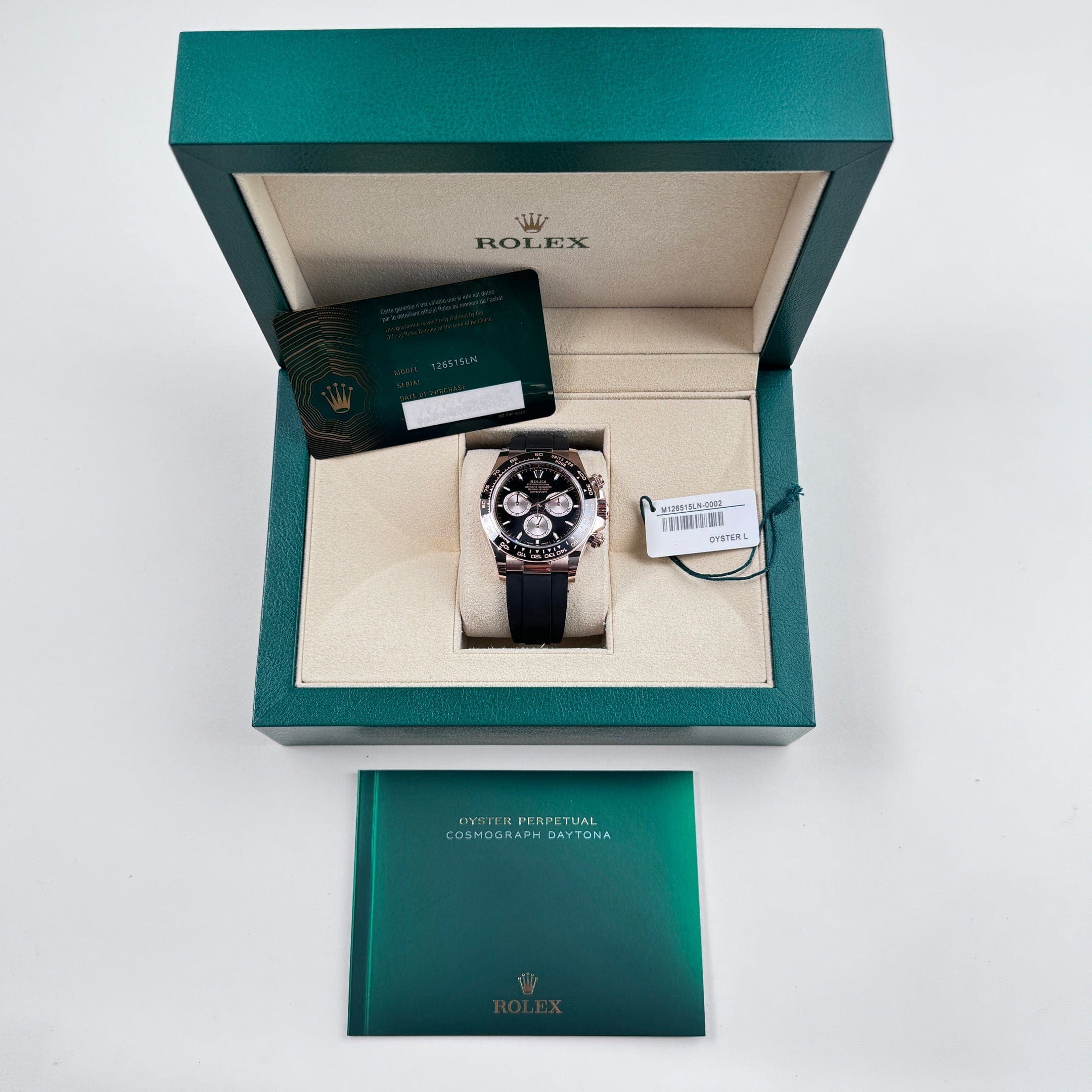 Powered by the in-house Caliber 4131, the 126515LN delivers precise timekeeping, a robust 72-hour power reserve, and the reliability for which Rolex is known. The Oysterflex bracelet, combining a metal blade with a rubber coating, ensures both durability and exceptional comfort on the wrist. With its bold design, high-performance movement, and distinctive Everose gold construction, the Daytona 126515LN is a perfect blend of style, precision, and practicality.