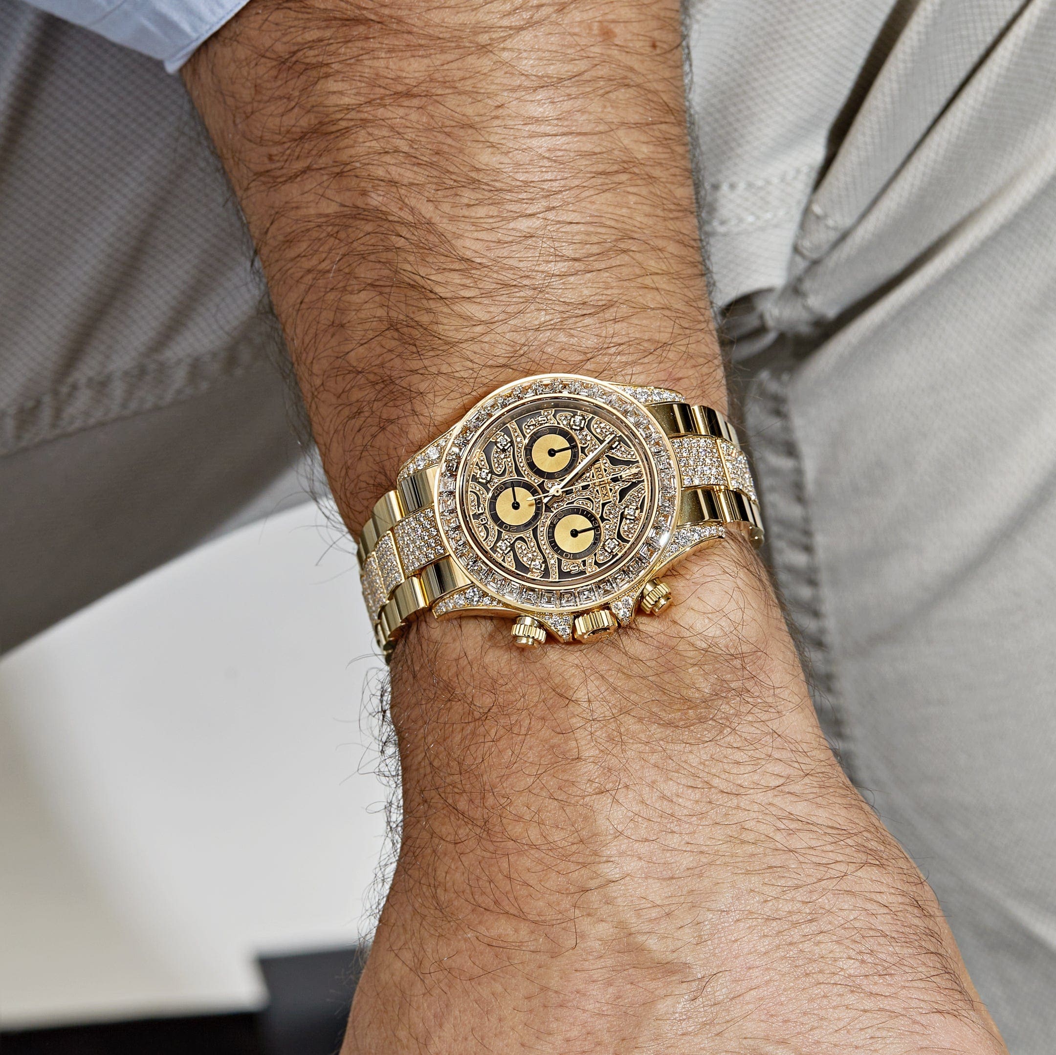 Introducing the Rolex 116598TBR ‘Eye of the Tiger’ in 18k Yellow Gold, a timepiece that combines the legendary Daytona design with a mesmerizing and unique dial inspired by the fierce beauty of the tiger. Diamonds highlight the shape of the watch, from the crown guards to the clasp on the bracelet. A gold, black, and diamond dial forms a tiger stripe pattern with golden sub-dials outlined in intense black inspired by the untamed eyes of the jungle cat it’s named after.
