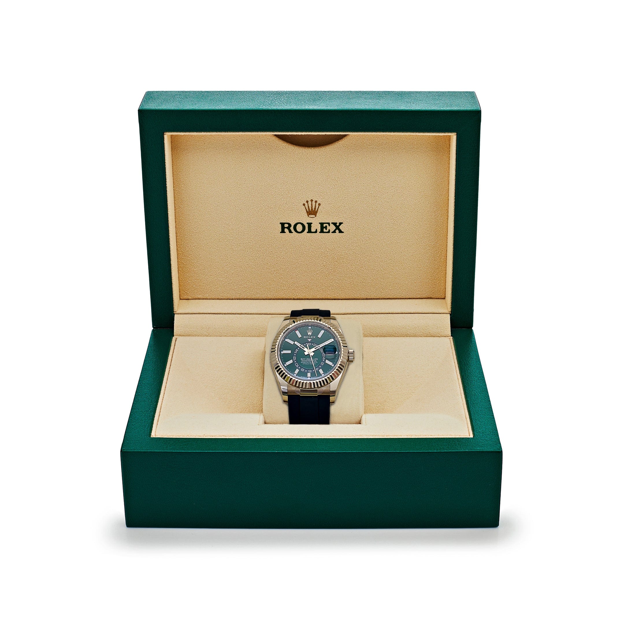 The vibrant bright green dial offers exceptional legibility and modern flair, enhanced by luminous hour markers, a 24-hour off-center disc for second time zone tracking, and a subtle month display via apertures above each hour marker. Powered by the updated Caliber 9002, the watch delivers refined performance, precision, and a 72-hour power reserve. Fitted with Rolex??s high-performance Oysterflex bracelet and an 18k yellow gold Oysterclasp, the Sky-Dweller 336238 blends technical sophistication with bold style??perfect for world travelers who demand both functionality and flair.