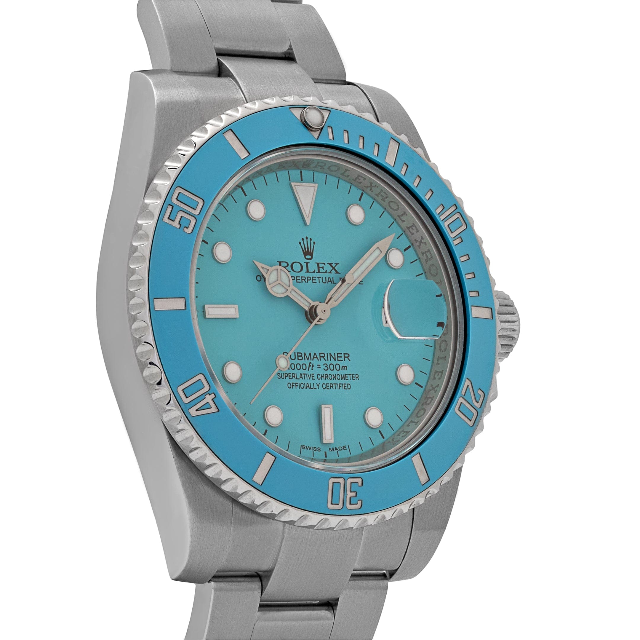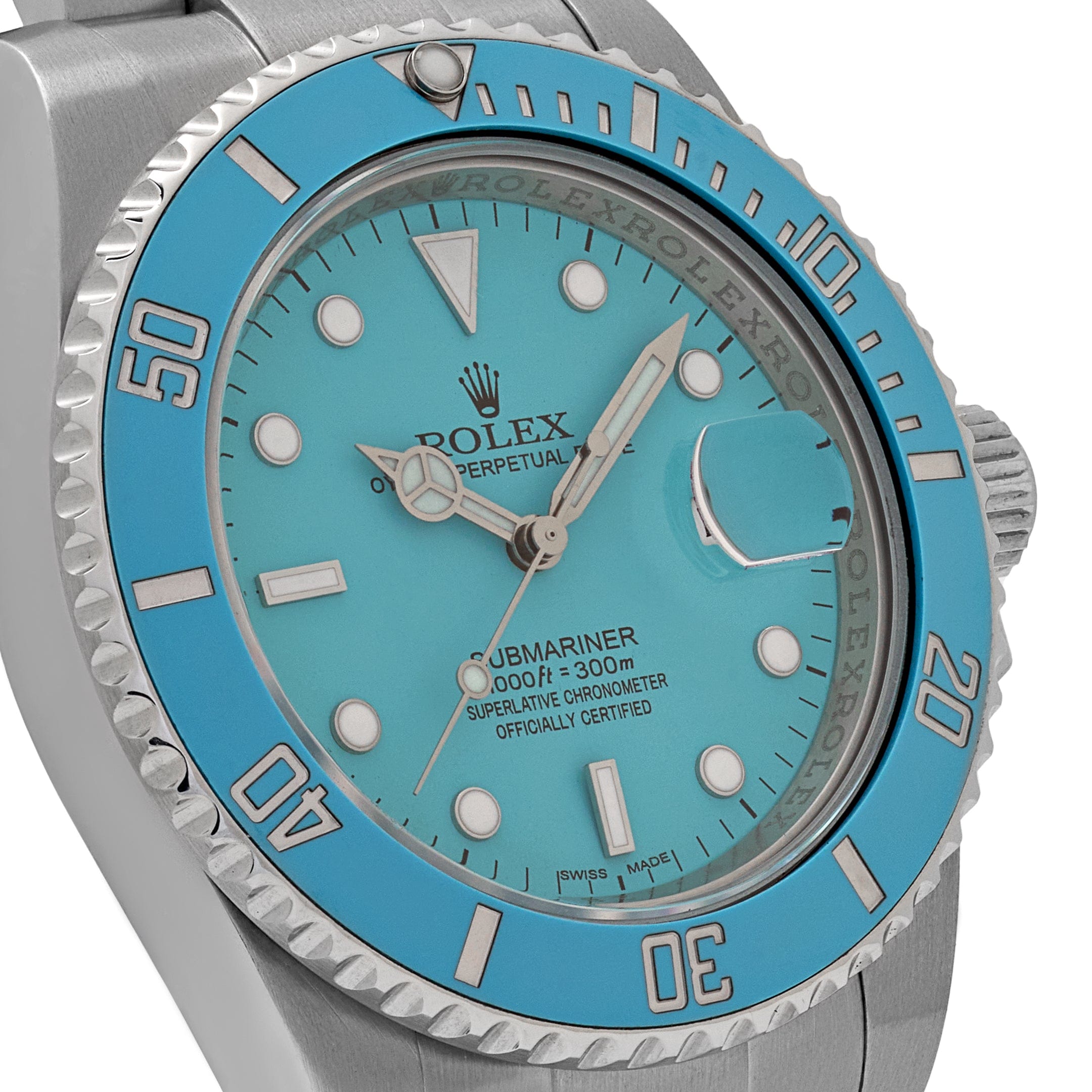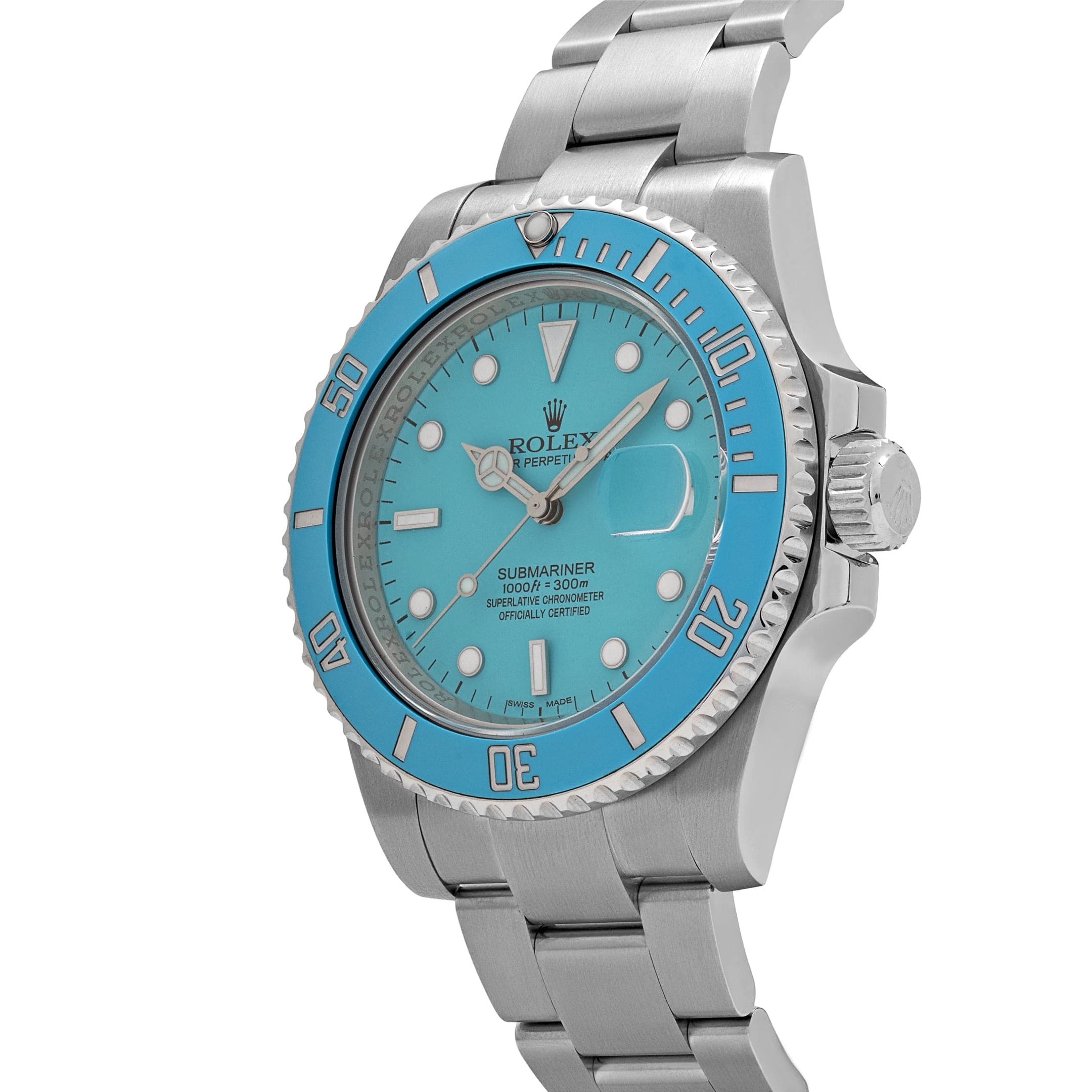 The 40mm Oyster case and original Rolex automatic movement remain unchanged, ensuring the watch maintains its legendary reliability and precision. As a customized piece, this Submariner Date 116610LN with its blue enhancements offers a unique opportunity for collectors or enthusiasts who appreciate the blend of iconic Rolex craftsmanship and personalized style.