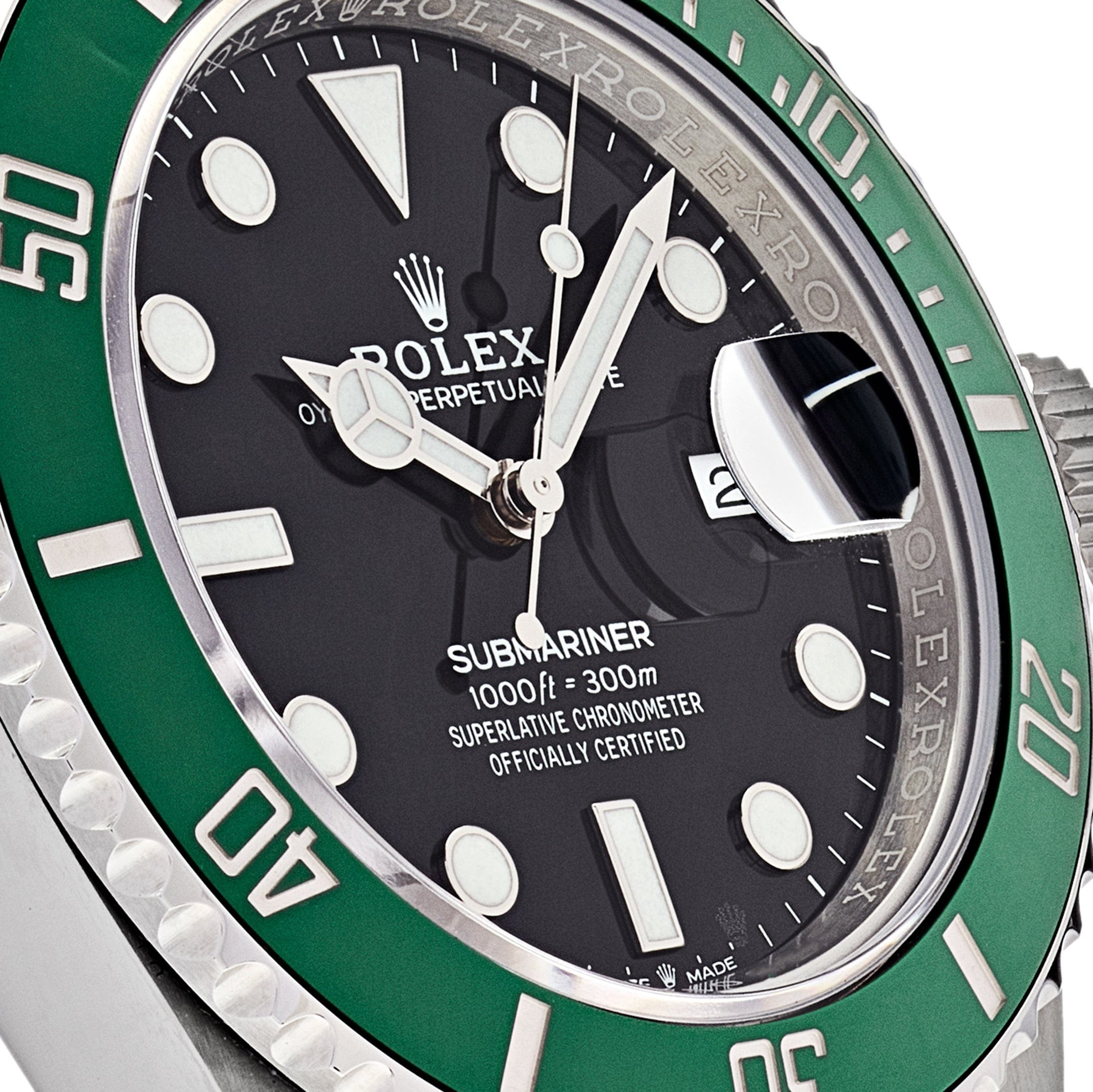 This Rolex Date 126610LV is designed in a 41mm stainless steel case, black dial, green bezel, and styled on a stainless steel Oyster bracelet. The bezel has ribbed edges that are easy to grip underwater.?Luminous hour markers, hands, and a?Chromalight?display provide clear legibility in every circumstance. Features that let?the wearer take full advantage of the 60-minute increment function and safely keep track of?their dive. The Rolex Submariner 126610LV?is a?reliable timepiece, ready for any adventure.