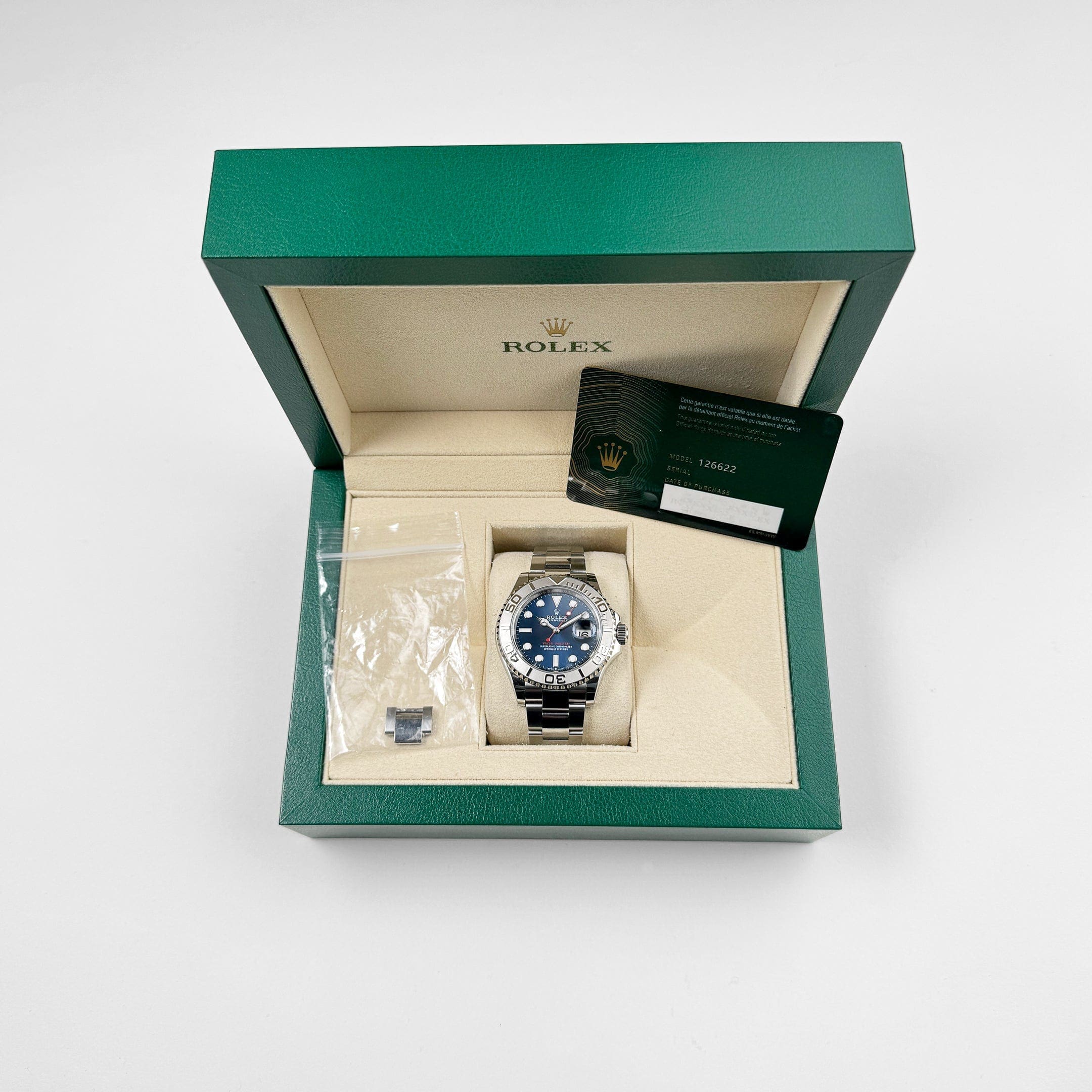This Rolex is designed with a 40mm stainless steel case and blue dial, styled with an Oyster steel strap. Luminous hour markers, hands, and a Chromalight display provide clear legibility in every circumstance. Complications include a bidirectional 60-minute bezel, stop-time keeping, and water resistance up to 100 meters. Much more than a luxury watch, the Rolex Yacht-Master 126622 is a must-have for your next sailing expedition.