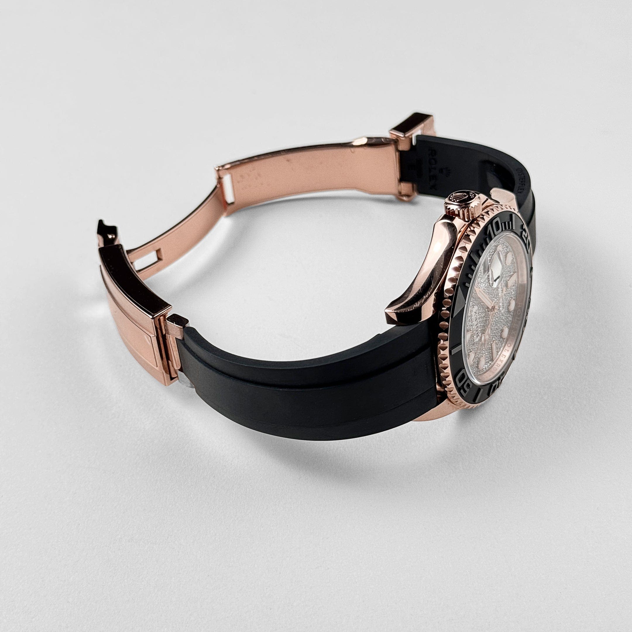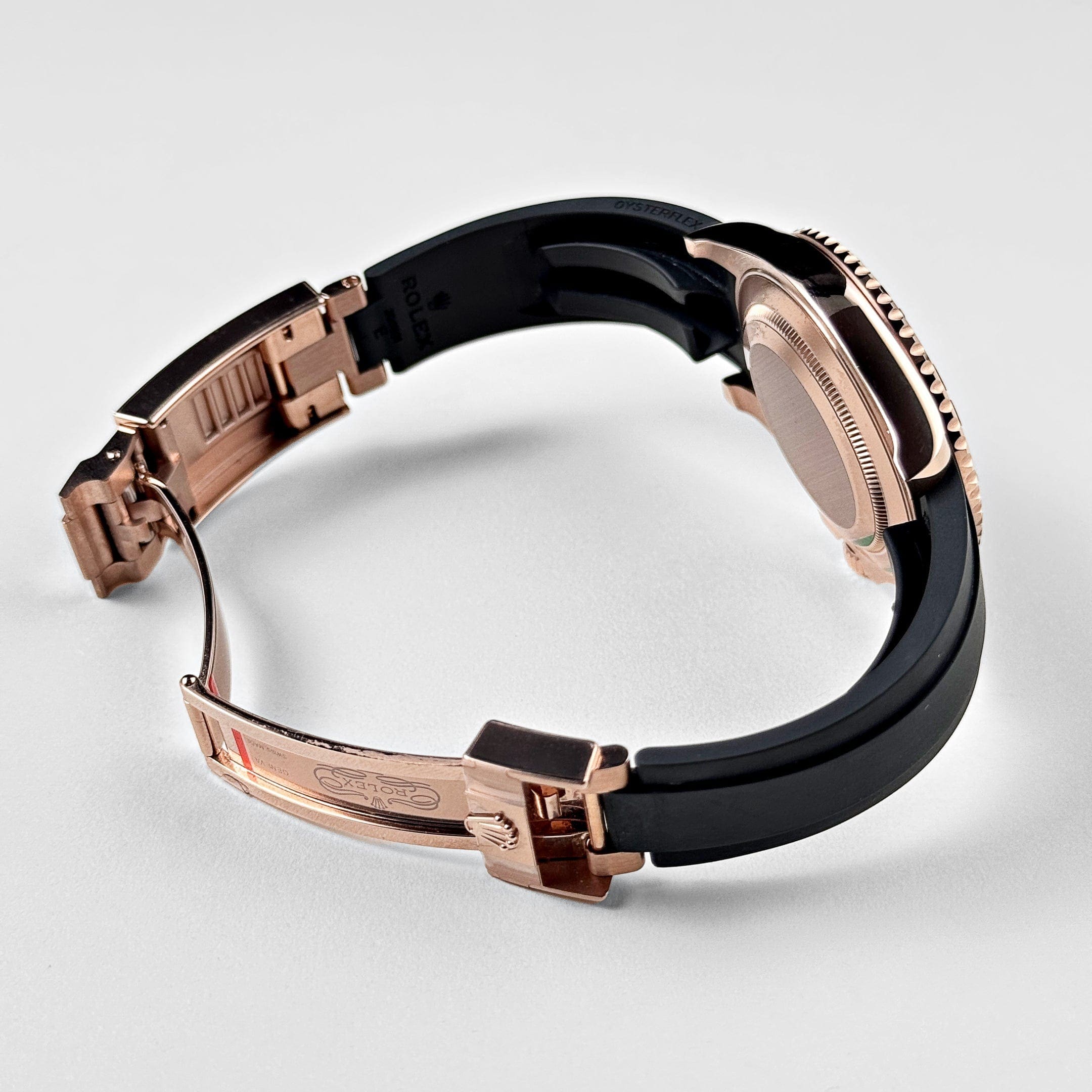 The Rolex 126655 is a striking fusion of luxurious materials and nautical-inspired design. Crafted in 18k Everose gold, the 40mm case exudes elegance while maintaining the robust and functional build the Yacht-Master is known for. The bidirectional rotatable bezel features a matte Cerachrom insert with raised numerals, offering both practicality and a bold aesthetic.