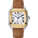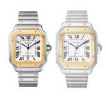 Santos de Cartier – where precision meets minimalism A tribute to aviation innovator Alberto Santos-Dumont Encased in steel and 18K yellow gold Silvered opaline dial with the classic Cartier blued-steel sword-shaped hands and a date display Driven by the calibre 1847 MC self-winding mechanical movement for precision and dependability PRECISE PROPORTIONS AND REFINED DETAIL First introduced in 1904, the Santos de Cartier collection honours visionary aviator Alberto Santos-Dumont. Prioritising form, minimalist elegance, precise proportions, and refined detail, the collection is defined by its square case, softened by rounded corners and accented with exposed screws for a bold, functional aesthetic. Although the collection has been updated over the years, it retains the key elements that make it instantly recognisable to aviation enthusiasts and watch collectors alike. TECHNICAL INNOVATION Housed in a rounded square steel case with an 18K yellow gold bezel, this watch makes a statement with visible 18K yellow gold functional screws and a distinctive 7-sided crown set with a striking faceted blue spinel. Staying true to the brand’s elevated yet minimal design codes, the silvered opaline dial is plays host to steel Roman numerals and blued-steel sword-shaped steel hands. Easily customisable to reflect your personal sense of style, the 41.9 x 35.1mm timepiece is supplied with two interchangeable straps fitted with the QuickSwitch system – one in brown calfskin and the other in polished steel with a folding buckle. Water resistant to 10 bar (100 metres), this model is powered with incredible precision by the calibre 1847 MC self-winding mechanical movement, complete with a 40-hour power reserve.
