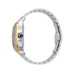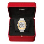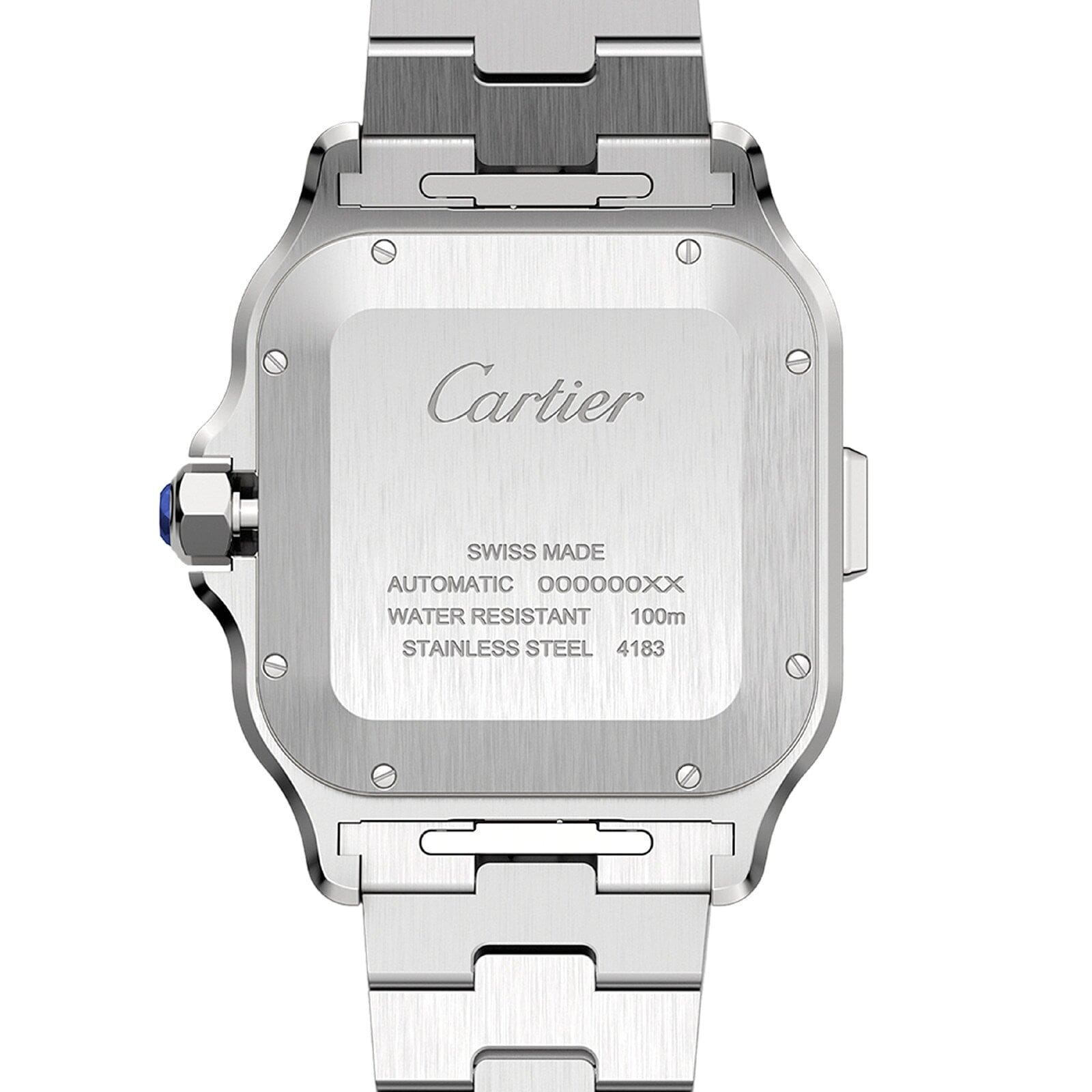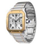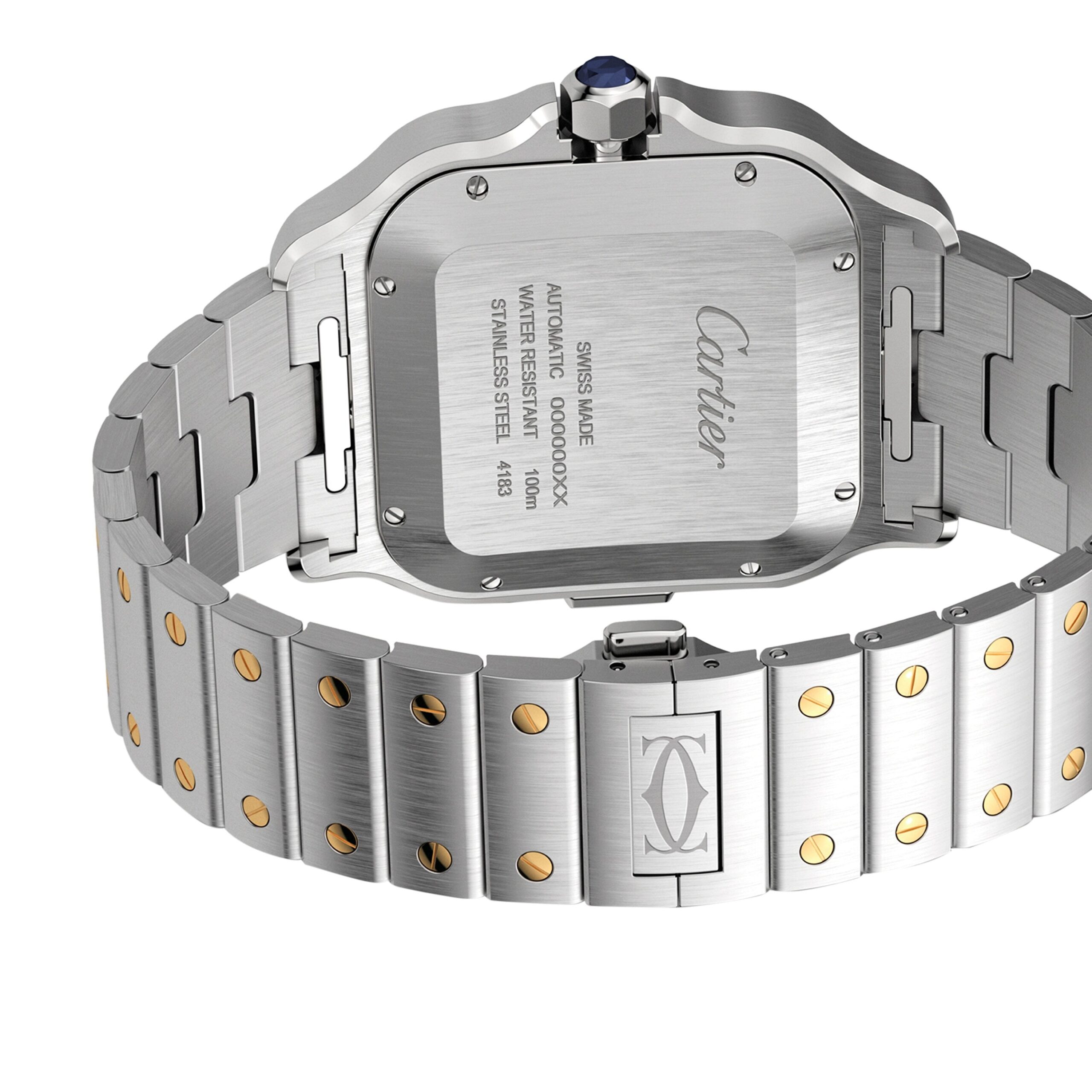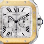Santos watch, extra-large model, chronograph mechanical movement with automatic winding, caliber 1904 CH MC. Steel case, 18K yellow gold bezel, 7-sided crown set with a faceted blue synthetic spinel, satin-brushed silver dial, black steel sword-shaped hands with luminescent material, sapphire crystal. Steel bracelet with ??SmartLink?? adjustment system. Second strap in rubber, with steel folding buckle. Both bracelets are fitted with the ??QuickSwitch?? interchangeability system. Case width: 43.3 mm, case thickness: 12. 5 mm. Water-resistant up to 10 bar (approx. 100 meters). 1904, Louis Cartier granted the wish of the famous Brazilian aviator Alberto Santos Dumont: to be able to tell time while flying. The birth of one of the first ever wristwatches sealed the bonds of friendship between these two pioneers. The rounded angles of the dial, the seamless curve of the horns, and the exposed screws made for an iconic watch that would inspire countless reinterpretations. Explore the full Cartier range here.