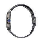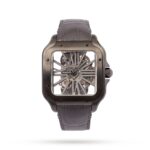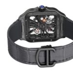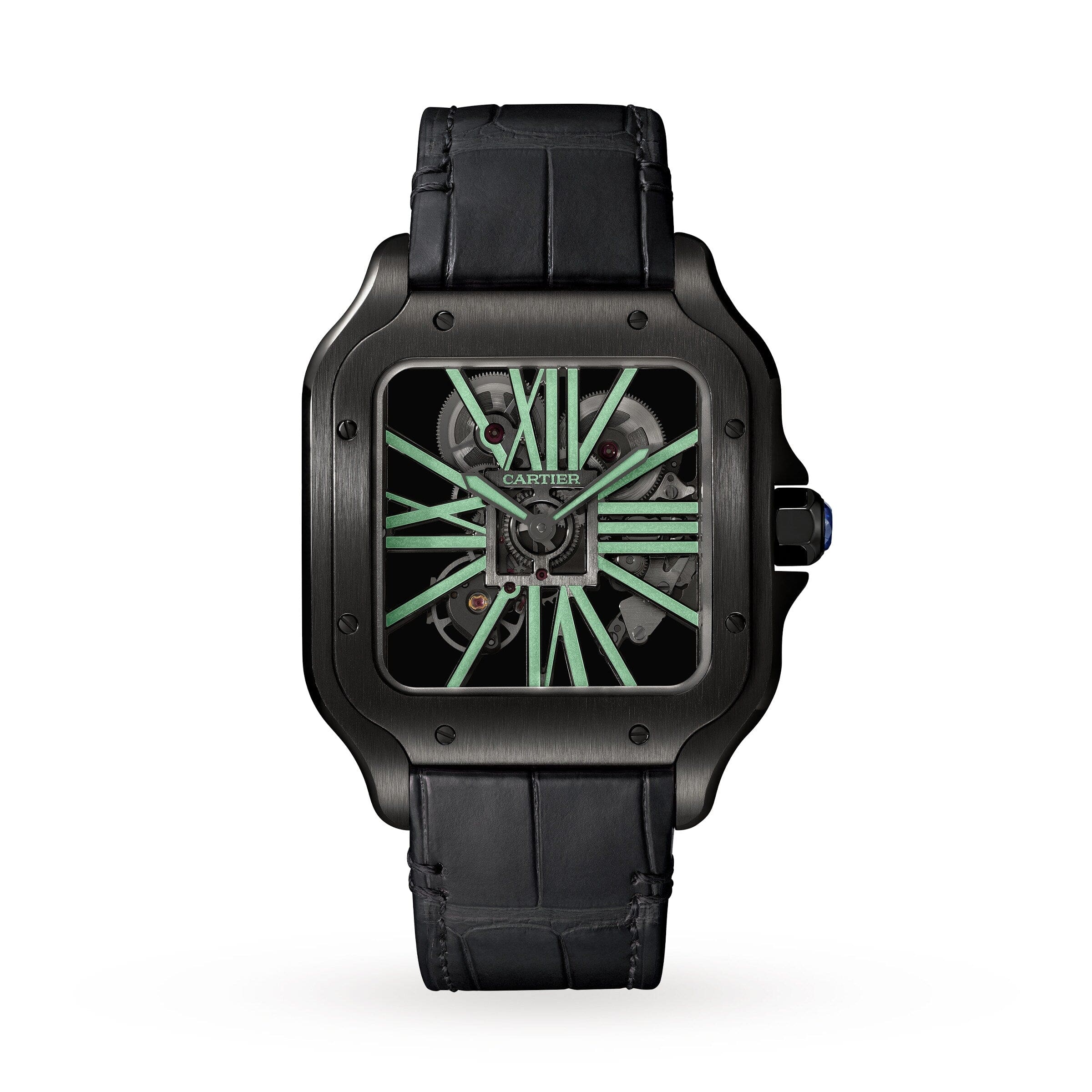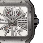 Santos Skeleton watch, large model, Manufacture mechanical movement with manual winding, calibre 9612 MC. Black ADLC steel case, 7- sided crown set with a blue synthetic spinel, polished grey steel sword-shaped hands, sapphire crystal and case back. Black alligator-skin strap, with black ADLC steel double adjustable folding buckle. Second strap in dark grey semi-matt alligator skin. Both bracelets are fitted with the ??QuickSwitch?? interchangeability system. Hours and minutes with skeletonised bridges forming Roman numerals, with luminescent material. Individually numbered movement consisting of 138 parts including 20 jewels. Movement dimensions: 28 mm x 28 mm, movement thickness: 3.97 mm, balance: 28,800 vibrations/hour, power reserve approx. 72 hours. Case width: 39.7 mm, case thickness: 9.08 mm. Water-resistant to 10 bar (approx. 100 metres).