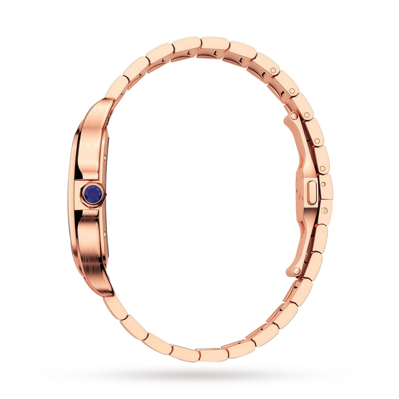 Santos Skeleton watch, large model, Manufacture mechanical movement with manual winding, calibre 9619 MC. Rose gold 750/1000 case, rose gold 750/1000 7-sided crown set with a faceted sapphire, gold sword-shaped hands, sapphire crystal and case back. Rose gold 750/1000 bracelet with SmartLink adjustment system. Second strap in alligator skin, with interchangeable rose gold 750/1000 folding buckle. Both are fitted with the QuickSwitch interchangeable system. Hours and minutes with skeletonised bridges forming Roman numerals. Individually numbered movement containing 138 parts including 20 jewels. Movement dimensions: 28 mm x 28 mm, movement thickness: 3.97 mm, balance: 28,800 vibrations/hour, power reserve approx. 72 hours. Case width: 39.7 mm, case thickness: 9.08 mm. Water-resistant to 10 bar (approx. 100 metres).