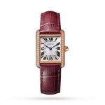 Tank Louis Cartier watch, small model, Manufacture mechanical movement with manual winding. Case and beaded crown in rose gold 750/1000 set with 41 brilliant-cut diamonds totalling 0.47 carats. Silver-grained dial, blued-steel sword-shaped hands, mineral crystal, claret alligator-skin strap, ardillon buckle in rose gold 750/1000. Case dimensions: 29.5 mm x 22.0 mm. Thickness: 6.8 mm. Water-resistant to 3 bar (approx. 30 metres).