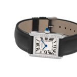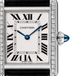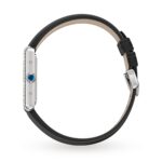Steel case, bezel set with 40 brilliant-cut diamonds totalling 0.39 carats, beaded crown set with a synthetic cabochon-shaped spinel, silvered dial, blued-steel sword-shaped hands, strap in black brushed calfskin, steel ardillon buckle. Case dimensions: 29. 5 mm x 22 mm, thickness: 6.6 mm. Water-resistant to 3 bar (approx. 30 metres).