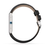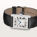 Tank Must watch, large model, high autonomy quartz movement. Steel case, beaded crown set with a synthetic cabochon-shaped spinel, silvered dial, blued-steel sword-shaped hands, interchangeable black grained calfskin strap, steel ardillon buckle. Case dimensions: 33.7 mm x 25.5 mm, thickness: 6.6 mm. Water-resistant up to 3 bar